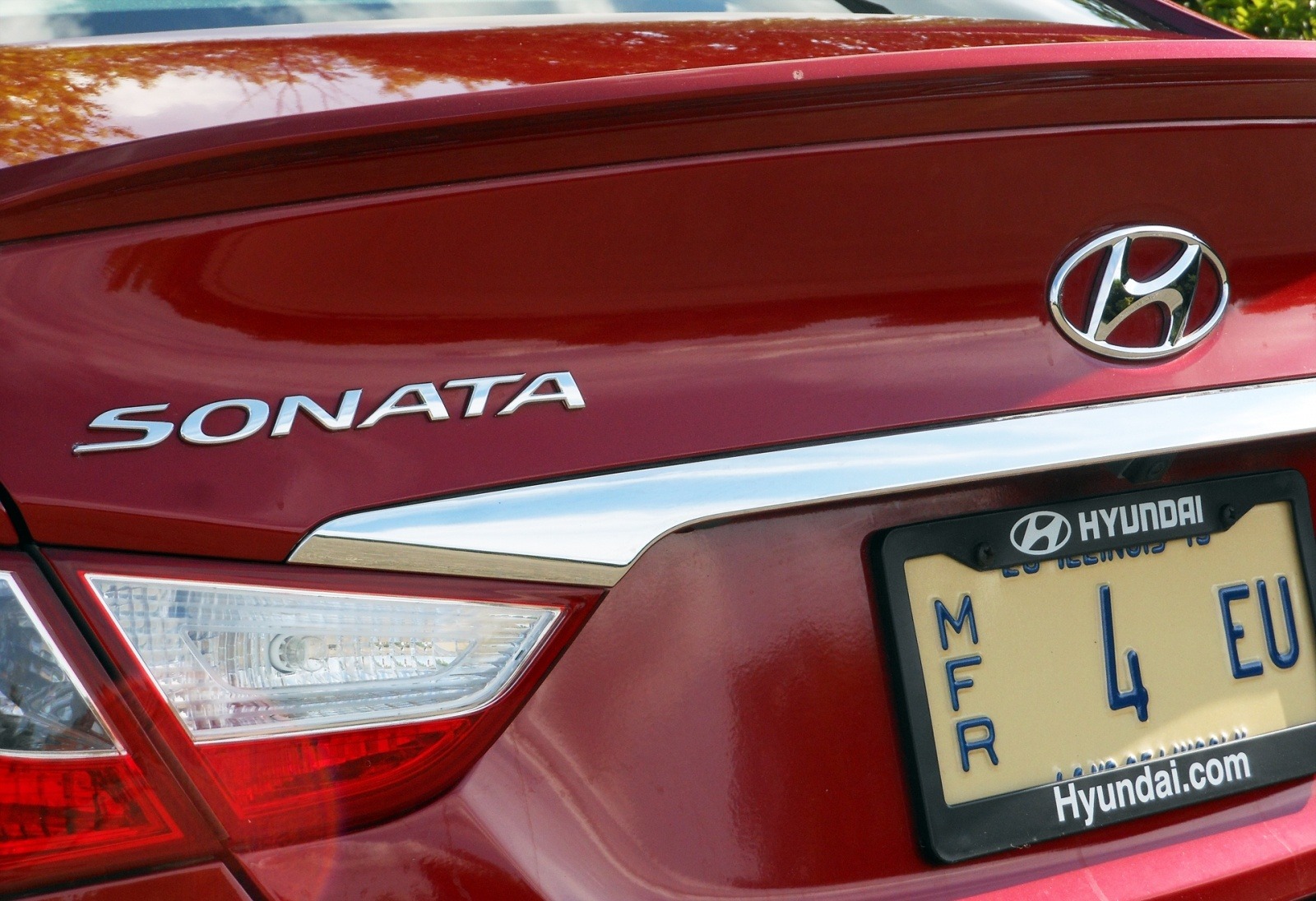 A closeup of the 2013 Hyundai Sonata SE 2.0T rear trunk lid in red shows the chrome "SONATA" lettering, Hyundai H emblem, chrome trunk lid accent strip, and an Illinois manufacturer press plate in a Hyundai dealer frame.