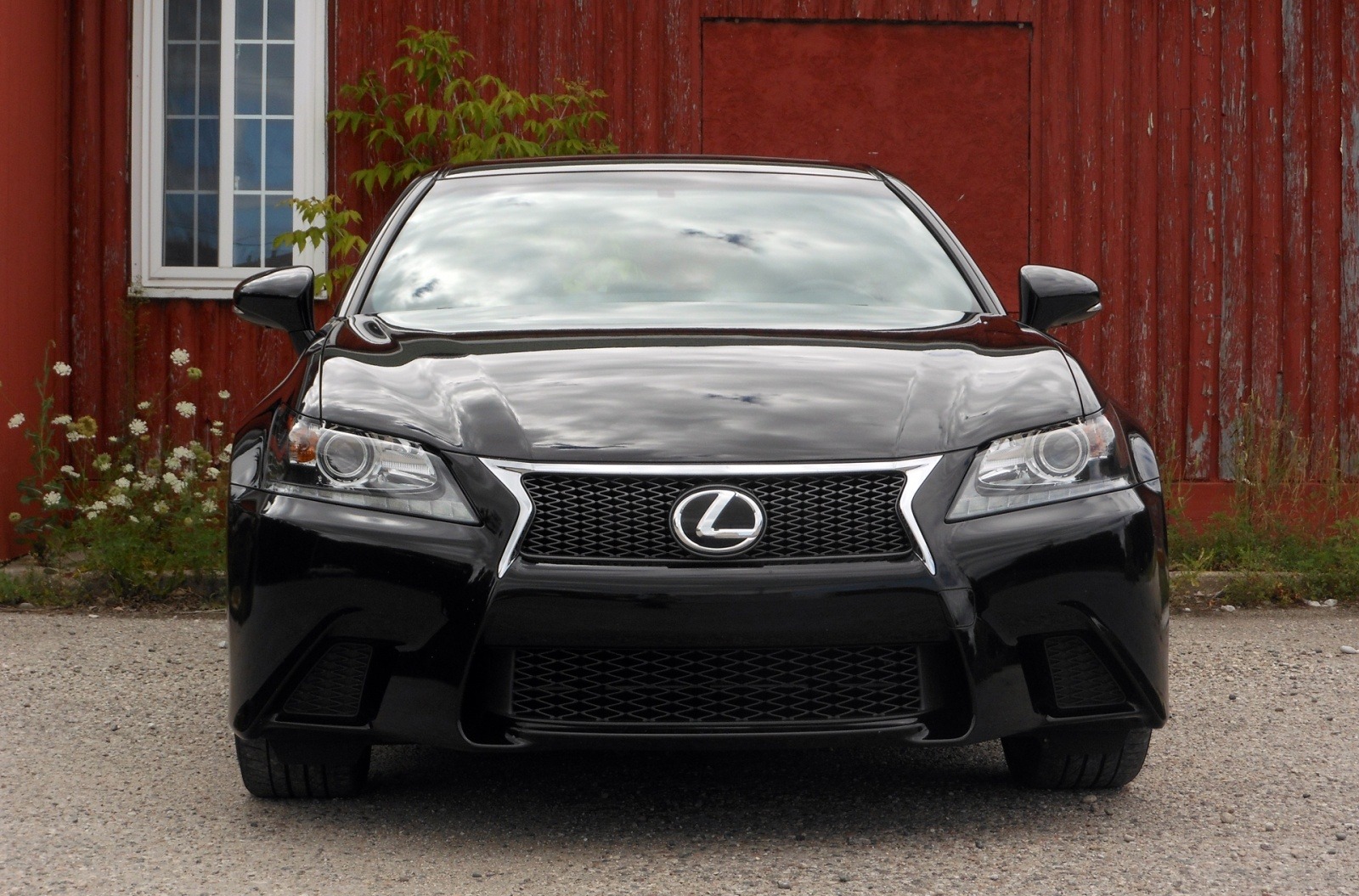 The 2013 Lexus GS 350 F-Sport's aggressive front fascia features the spindle grille flanked by projector headlamps. Shot head-on, the black sedan's sharp lines and wide lower air intakes demonstrate the F-Sport's sport-tuned aesthetic.