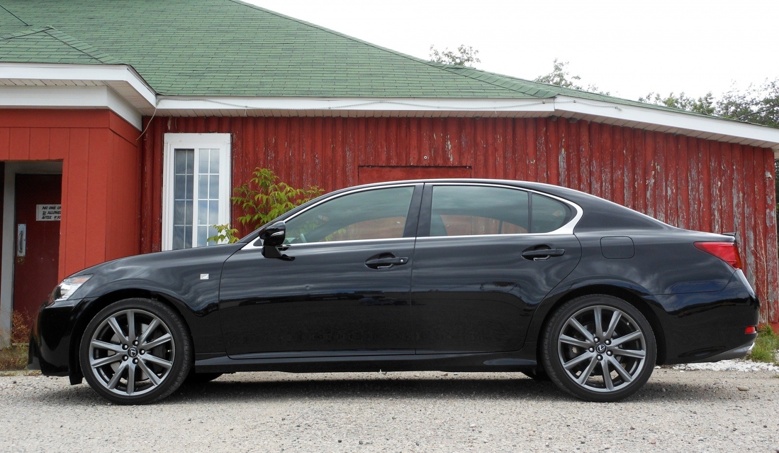 A clean driver-side profile view of the black 2013 Lexus GS 350 F-Sport, capturing the sedan's fastback-style roofline, character line along the door, dark F-Sport alloy wheels, and low stance. Shot near a red barn in natural overcast light.