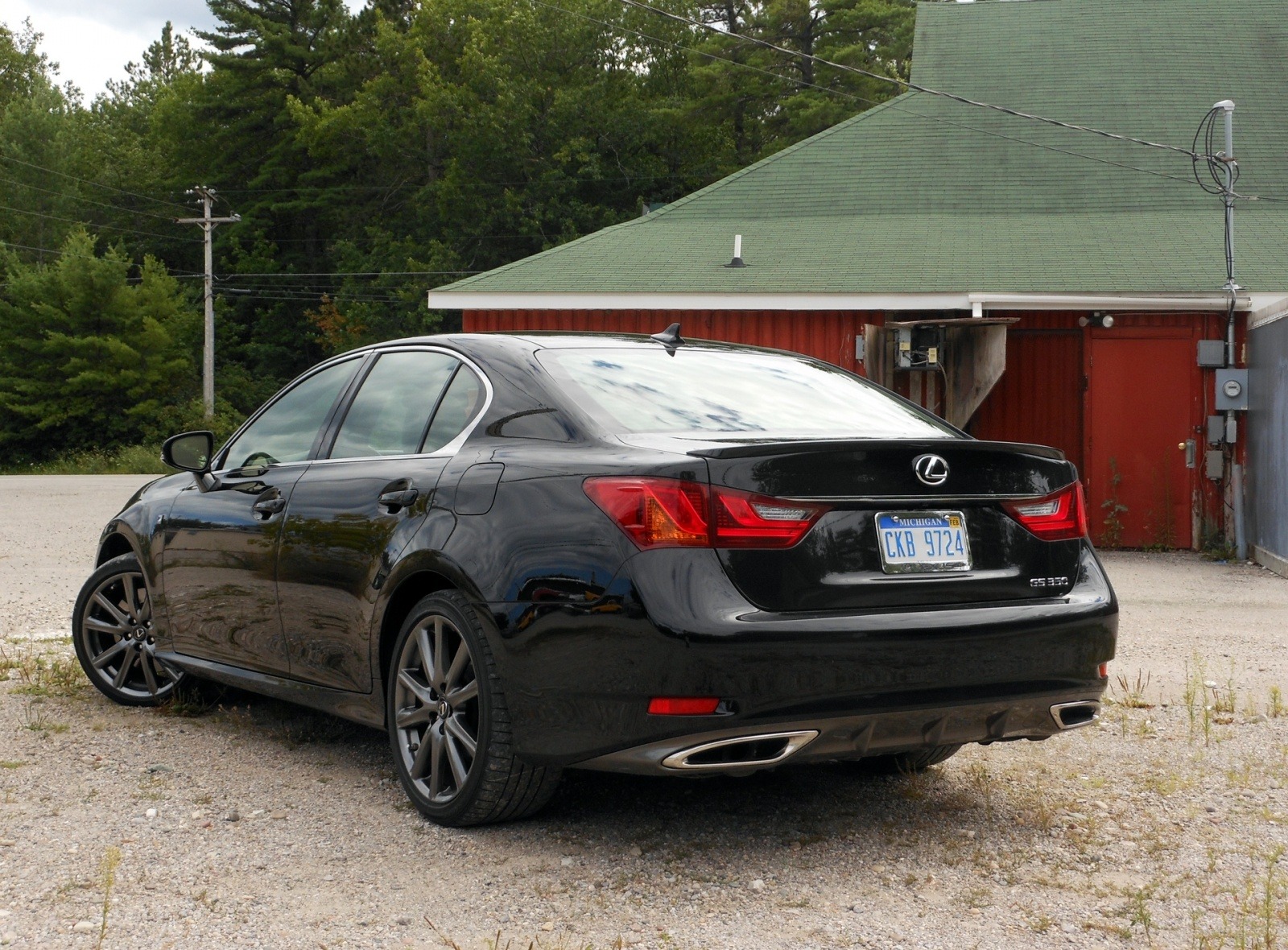 The rear three-quarter view of the black 2013 Lexus GS 350 F-Sport, showing the sculpted trunk lid, L-shaped LED taillights, dual exhaust outlets, and dark F-Sport alloy wheels. The car is parked on gravel near a red barn.
