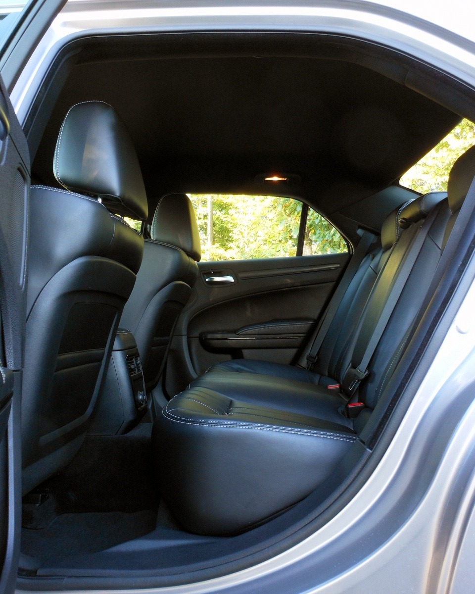 The rear seat of the 2013 Chrysler 300S offers a wide bench upholstered in black leather with white contrast stitching and three-point seatbelts for all outboard positions. Rear passenger headroom is ample despite the sedan's low roofline.