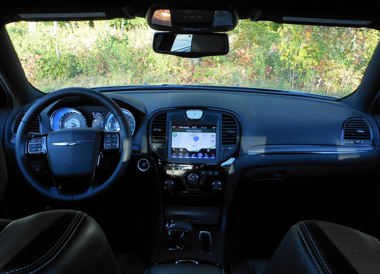 The 2013 Chrysler 300S dashboard centers on an 8.4-inch Uconnect touchscreen displaying navigation, flanked by the analog clock on the center stack and illuminated instrument cluster with blue gauge lighting. Carbon fiber-look trim accents the dash and door panels.