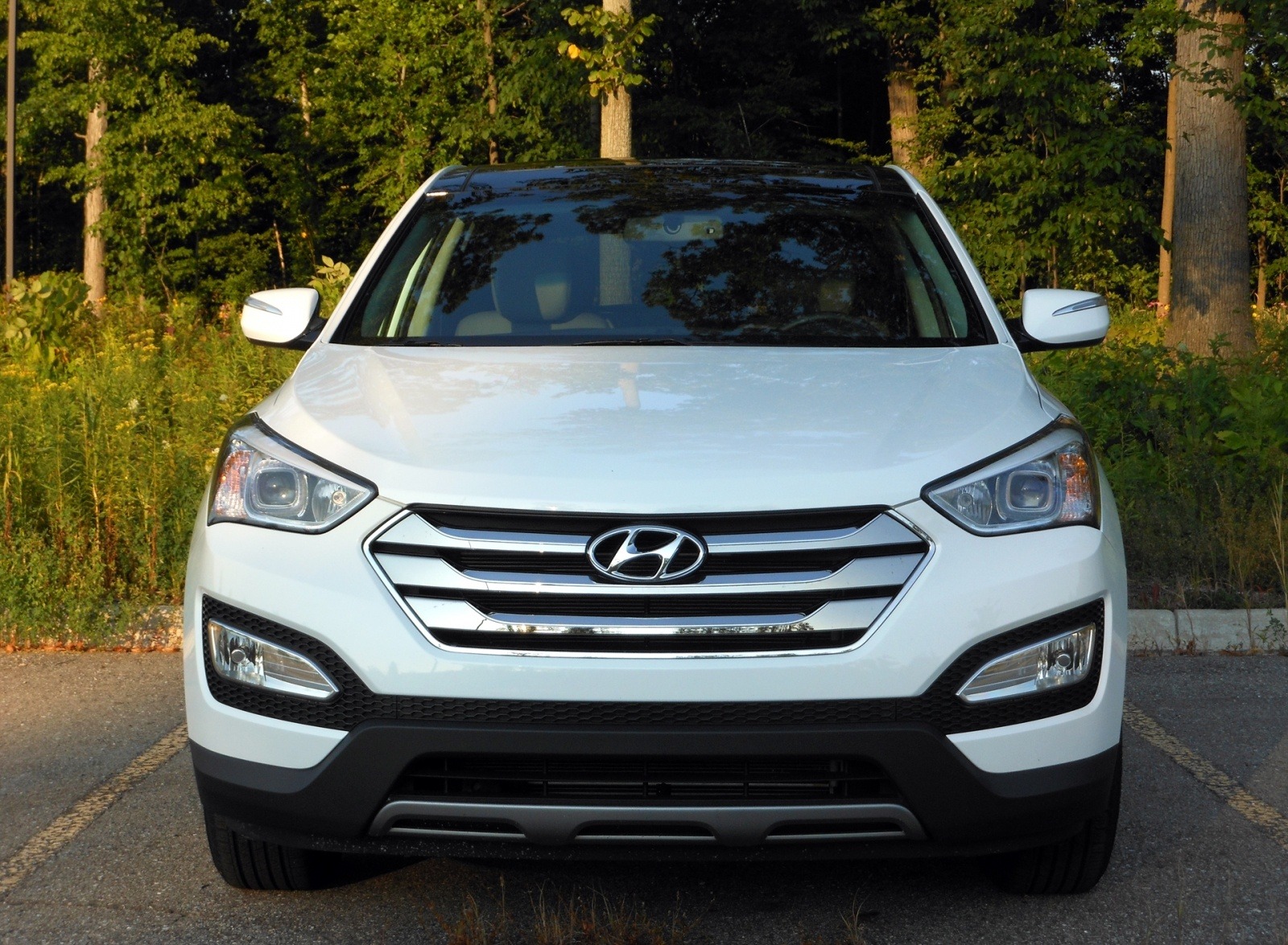 The 2013 Hyundai Santa Fe Sport 2.4 is photographed head-on in white, showing off the wide chrome grille bar, projector headlights, and sculpted lower fascia against a green wooded backdrop.