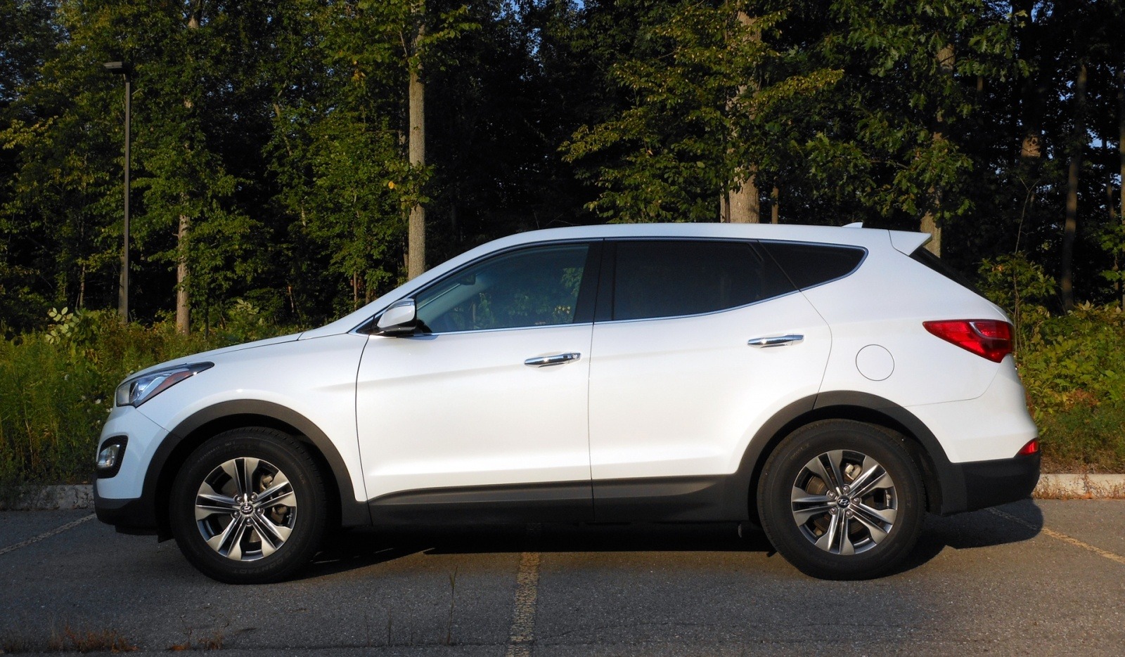 The Santa Fe Sport's profile reveals a taut, athletic silhouette with a gently raked roofline, body-colored cladding along the lower sills, and multi-spoke alloy wheels that fill the arches well. The proportions favor a trim footprint without sacrificing passenger room.