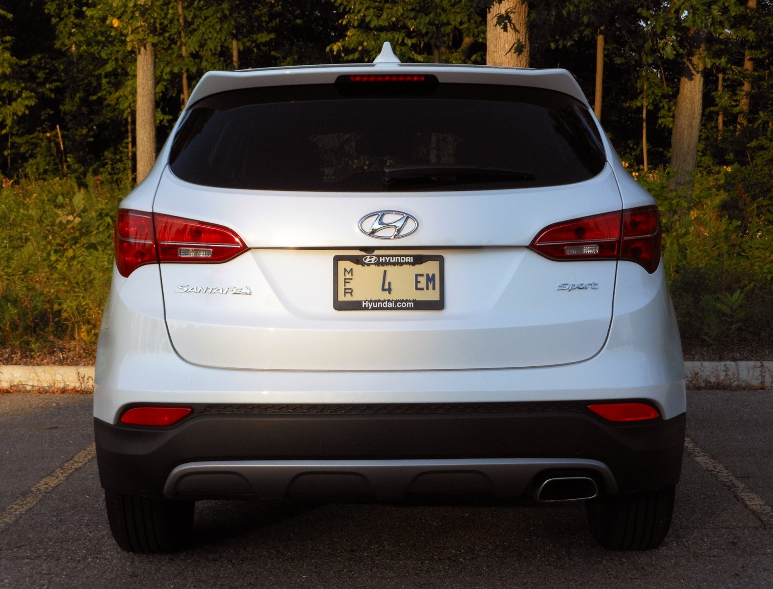 The 2013 Hyundai Santa Fe Sport 2.4 is shown straight-on from the rear in a silver finish, with the Hyundai emblem, dual exhaust outlets, and Santa Fe Sport badging clearly visible.