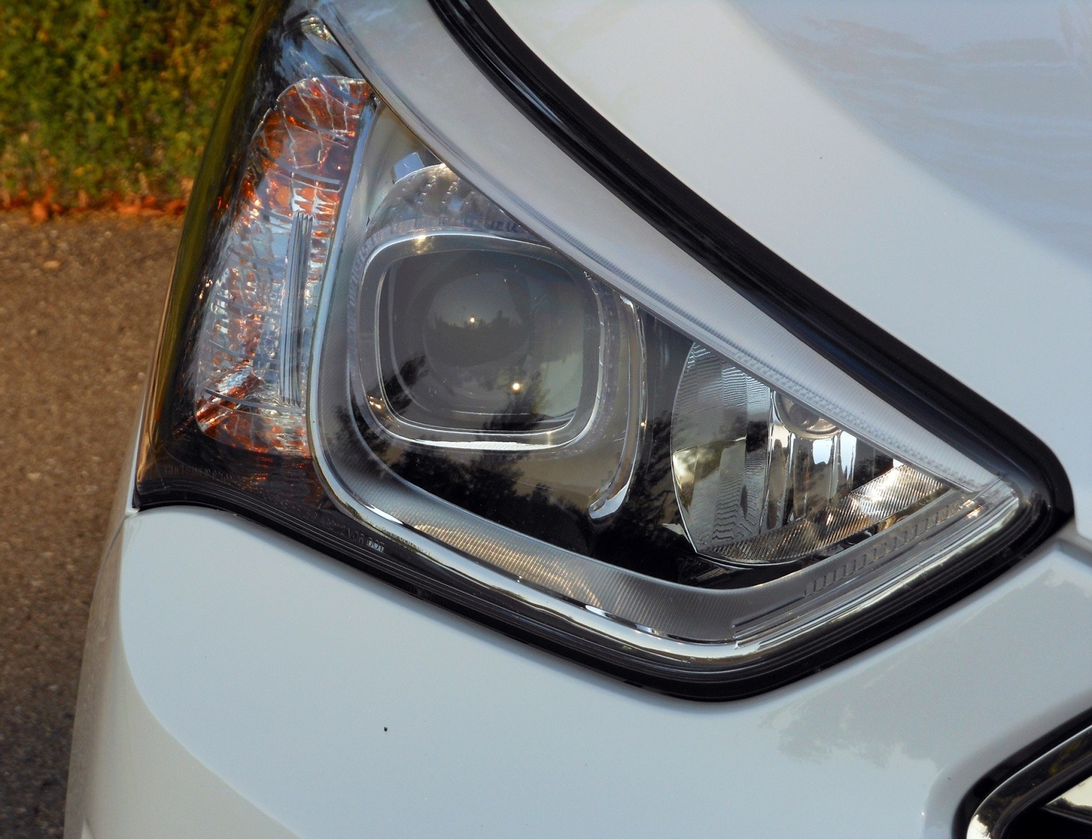The Santa Fe Sport's projector-beam headlight housing is a study in refined detail, with a square projector lens surrounded by chrome accents and a broad amber turn signal element integrated into the outer corner. It's a more sophisticated unit than the price point might suggest.