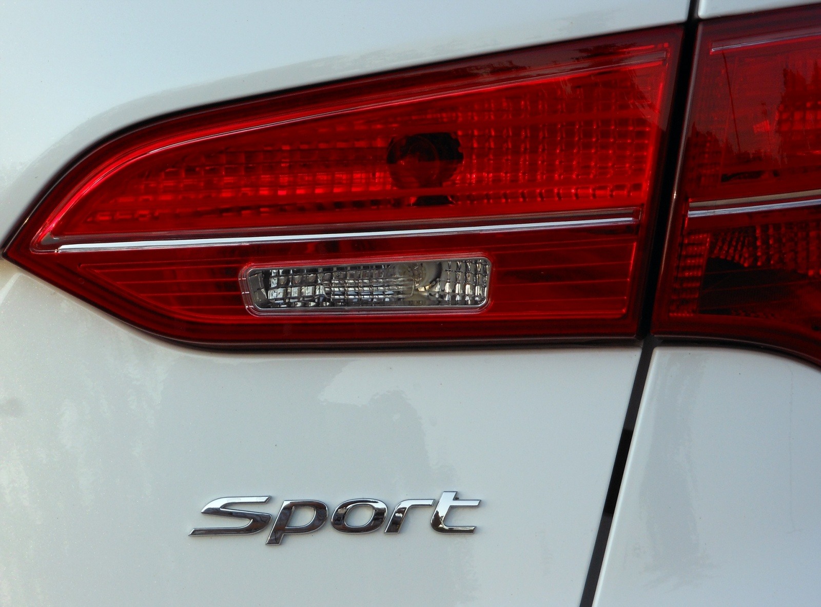 A close-up of the 2013 Hyundai Santa Fe Sport 2.4 rear quarter panel shows the wraparound taillight design and chrome "Sport" badge on the white exterior.