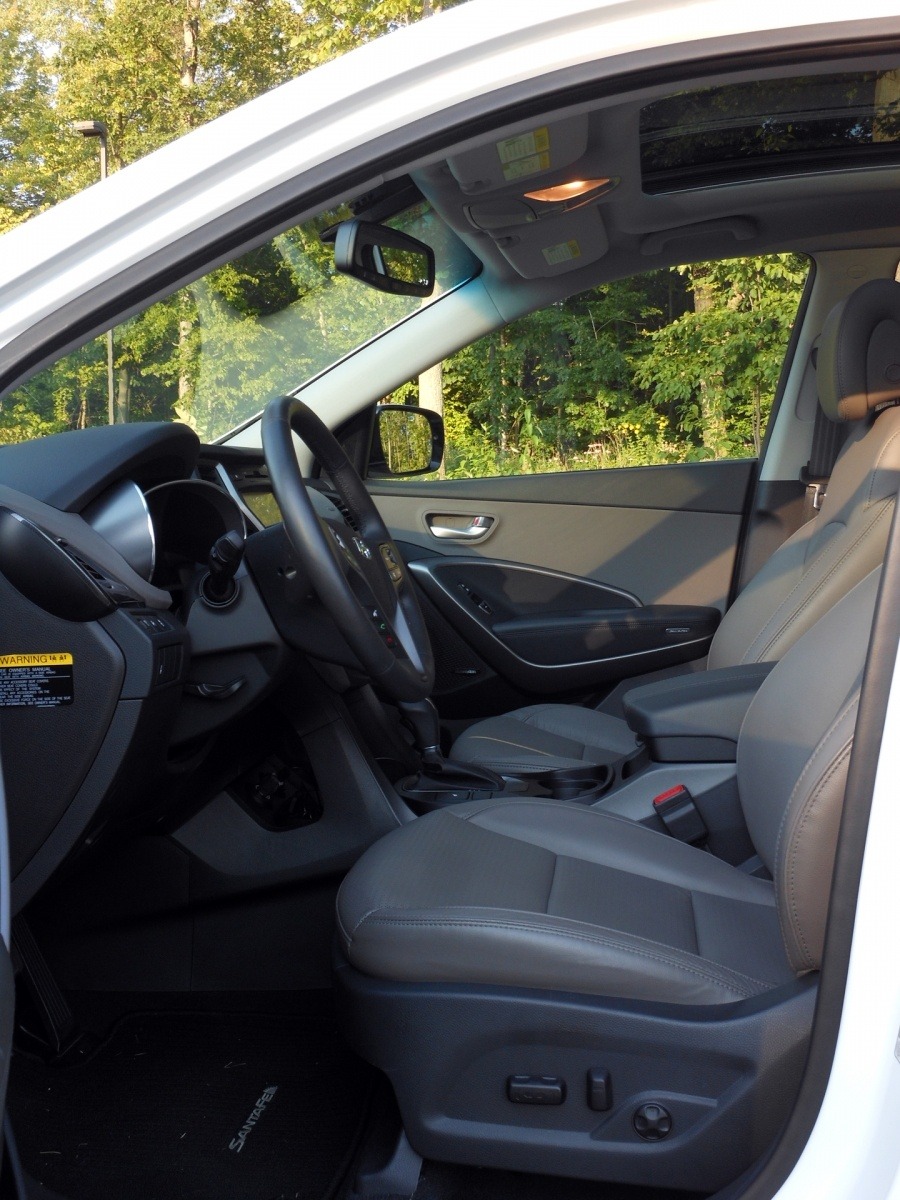 The front cabin of the Santa Fe Sport opens up to a well-organized cockpit with gray leather seating, a sport steering wheel, and a center console that keeps controls within easy reach. The driving position feels commanding without being elevated to the point of awkwardness.