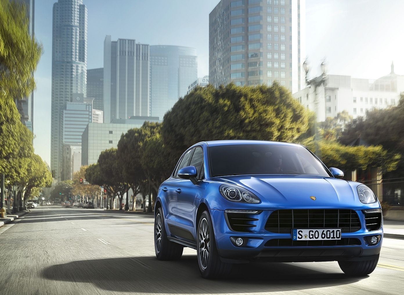 Shot head-on against a tree-lined downtown boulevard, the Macan S in blue showcases its broad, structured hood and the characteristic four-point LED daytime running light signature borrowed from the 911. The wide track and prominent wheel arches give the compact SUV a planted, purposeful road presence.