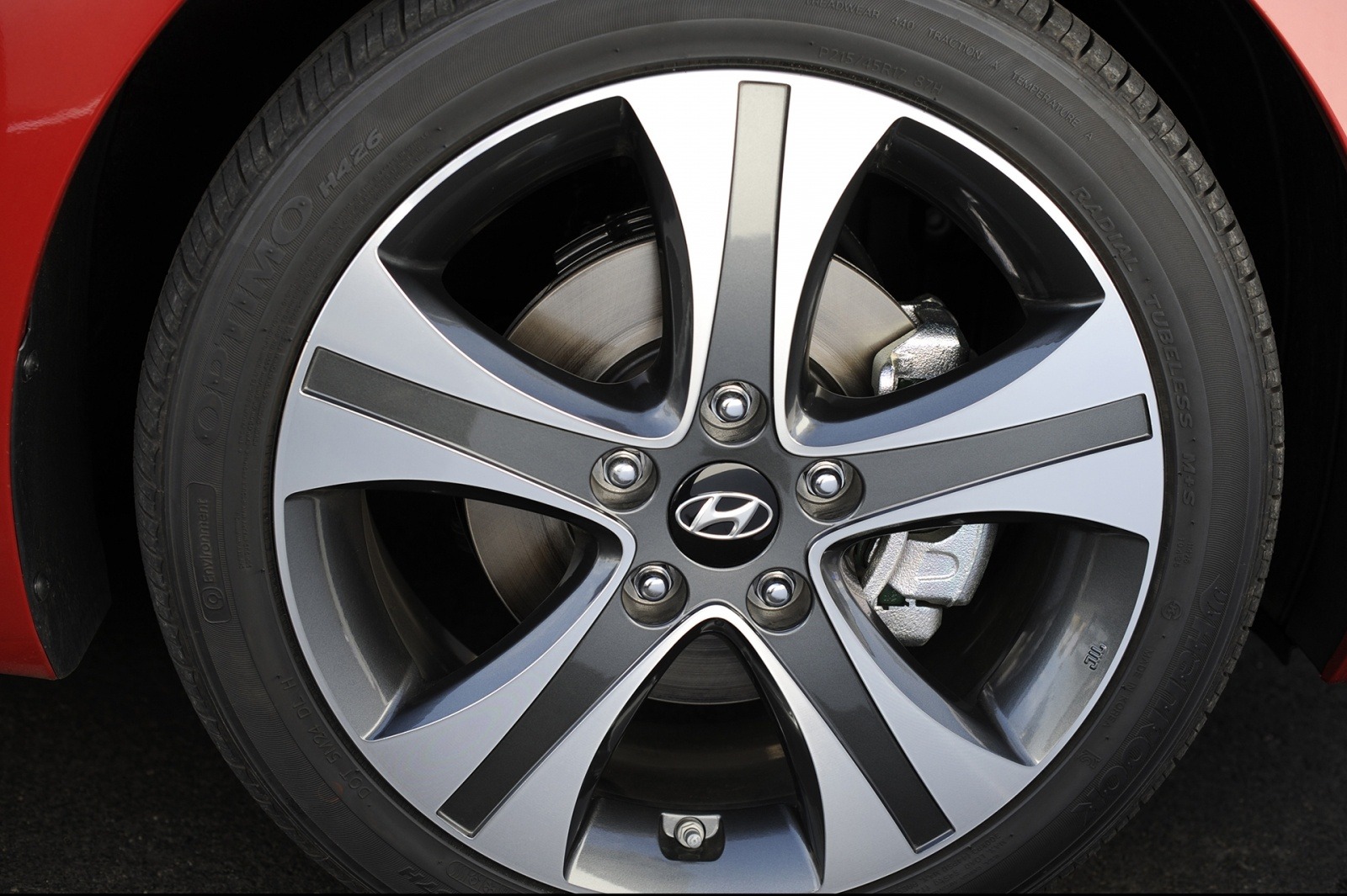 The 2014 Hyundai Elantra Sport rides on exclusive 17-inch machined-finish alloy wheels with a five split-spoke design. The brake caliper is visible behind the spokes, underscoring the Sport trim's upgraded hardware over base Elantra models.