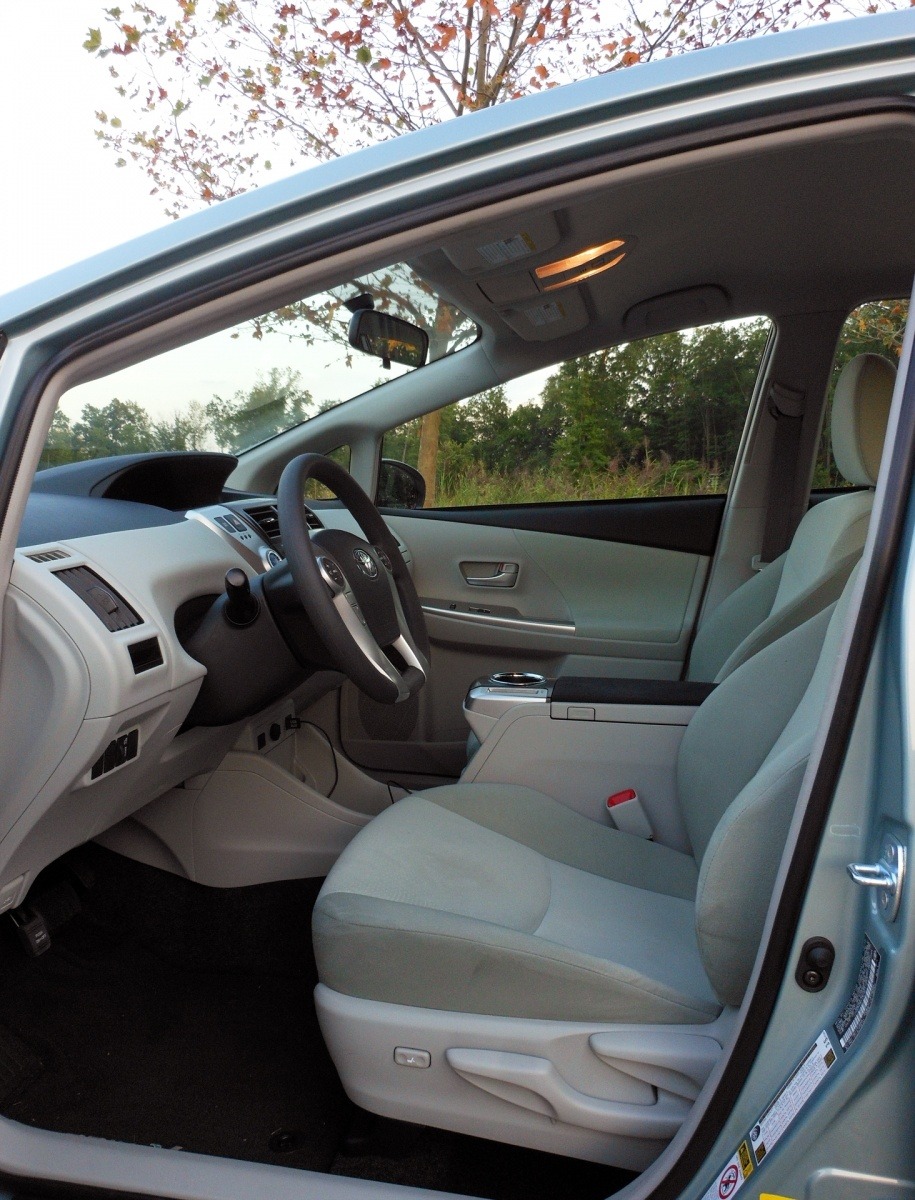 The front cabin of the Prius V Two features light gray cloth seating with a simple, functional design, paired with an upright dashboard and column-mounted shift mechanism that frees up floor space. Visibility is excellent thanks to the large side windows and thin A-pillar.