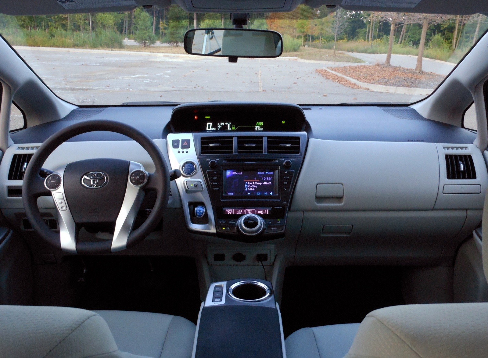 The Prius V's cockpit centers on a raised instrument pod with a color energy monitor display and a touchscreen infotainment unit flanked by climate controls. The flat, uncluttered center console and wide expanse of dashboard reflect Toyota's focus on a spacious, easy-to-use driver environment.