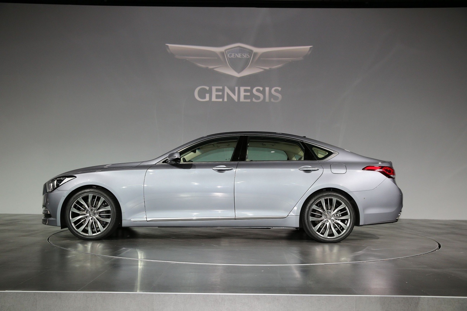 The silver 2015 Hyundai Genesis sedan is shown in a clean full side profile on a rotating display stage, highlighting the long hood, fastback roofline, and multi-spoke alloy wheels. The DH-generation body features a notchback silhouette with flush door handles and a pronounced shoulder line.