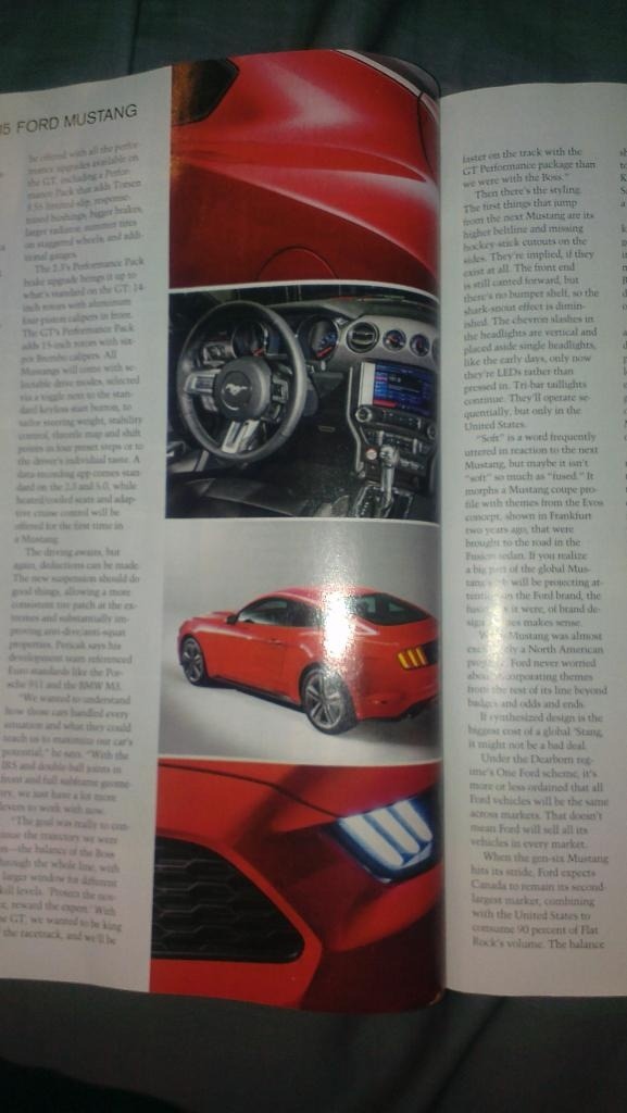 A leaked Autoweek page shows the 2015 Ford Mustang EcoBoost's interior alongside a side-profile detail shot of the Race Red coupe, offering the first look at the S550's new cockpit design and exterior character lines before the official reveal. The interior features a driver-focused layout with a prominent center console and updated gauge cluster.