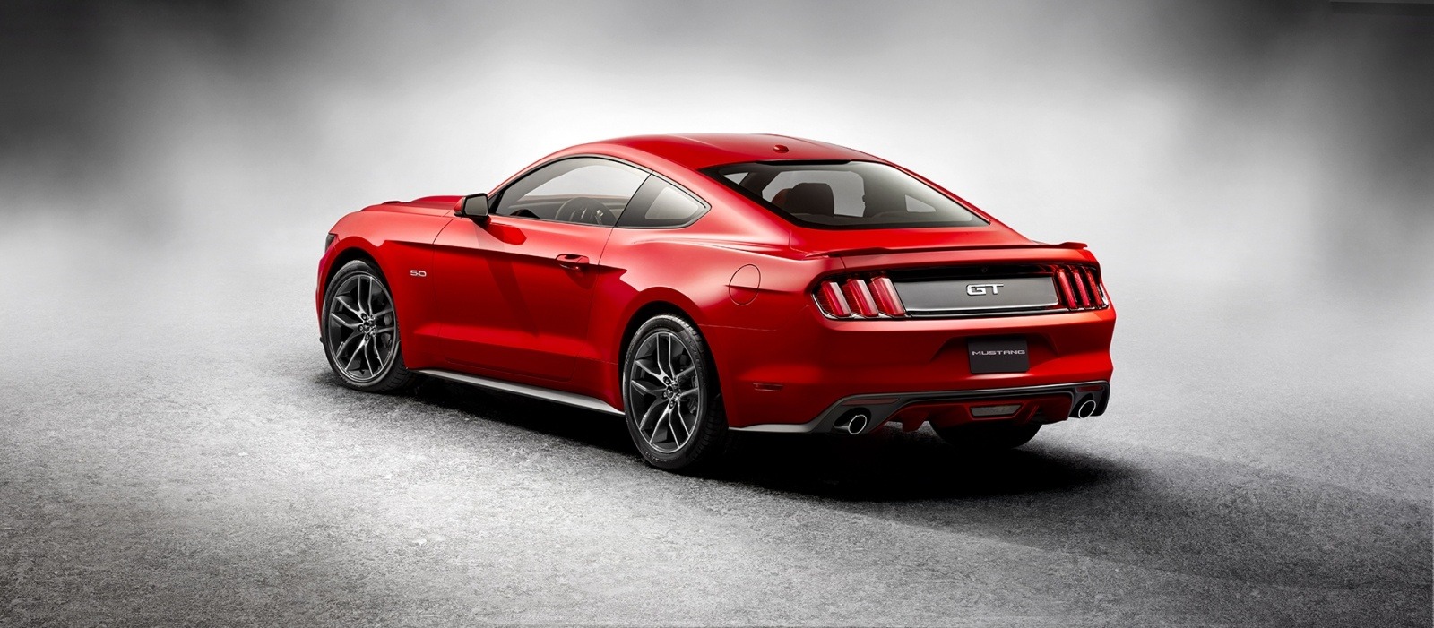 The 2015 Ford Mustang GT fastback in Race Red is shown in a studio rear three-quarter view, displaying the GT badge, sequential tri-bar taillights, 5.0 fender badge, and dual exhaust outlets. The misty grey background highlights the coupe's clean, muscular lines.