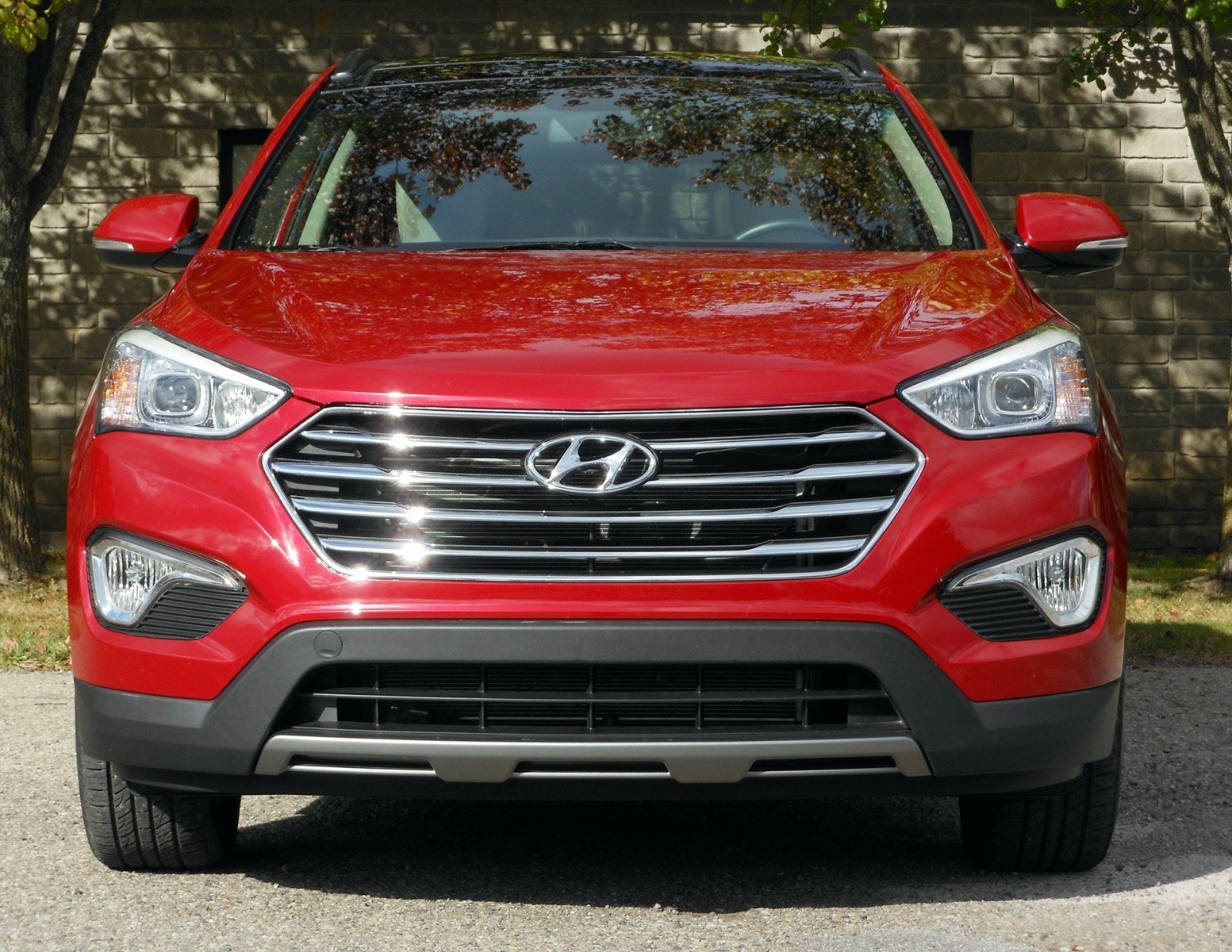 The Santa Fe's fluidic sculpture front end leads with a broad chrome grille and centered Hyundai badge, flanked by swept HID headlights and round fog lamps. The aggressive yet refined face set the three-row crossover apart in a crowded segment.