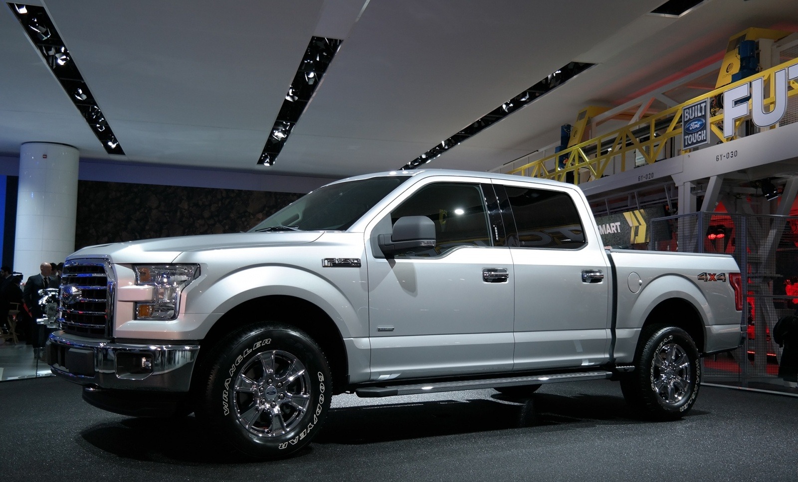 The 2015 Ford F-150 XLT SuperCrew in Oxford White is viewed from the passenger side, showing off the truck's clean aluminum bodywork and 4x4 bed graphics. The revised roofline and character lines mark a clear evolution from the previous generation.