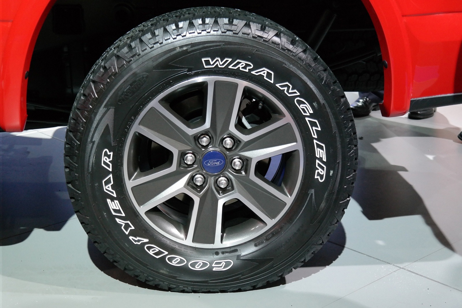 A close-up of the 2015 Ford F-150 XLT's machined aluminum alloy wheel fitted with a Goodyear Wrangler all-terrain tire on a Race Red truck at its auto show debut. The five-spoke design and Ford-oval center cap underscore the XLT's value-plus positioning.