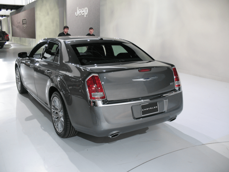 The 2011 Chrysler 300 displays its bold rear styling at an auto show, with chrome exhaust tips, sculpted taillights, and a wide trunk lid bearing the Chrysler nameplate. The gray exterior highlights the sedan's muscular haunch lines and flush-fitting multi-spoke alloy wheels.