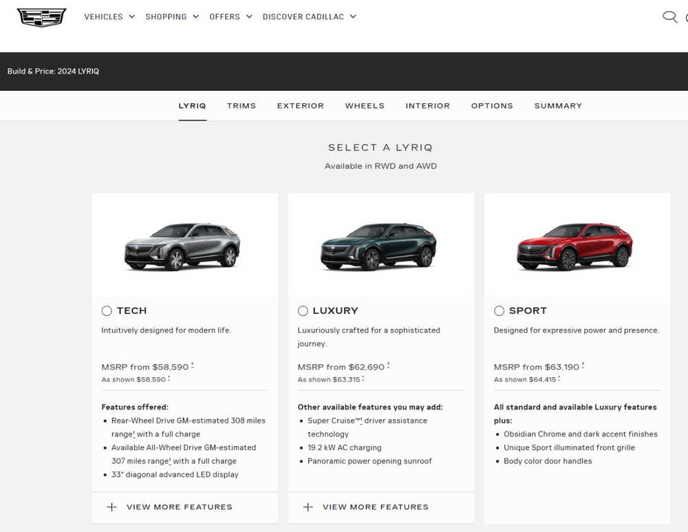 Here is the updated webpage for the LYRIQ and the configurator is live. 2024 Cadillac LYRIQ | All-Electric SUV | Model Overview Seems Cadillac has changed their labeling, Platinum is gone as you have a Tech Base auto and then from there you either go up the Luxury way with 3 levels of luxury trim or the Sport way with 3 levels of Sport trim. I have to think the V Series edition would be above the Sport trims. 3 Sport Trims 3 Luxury Trims Base Tech Level