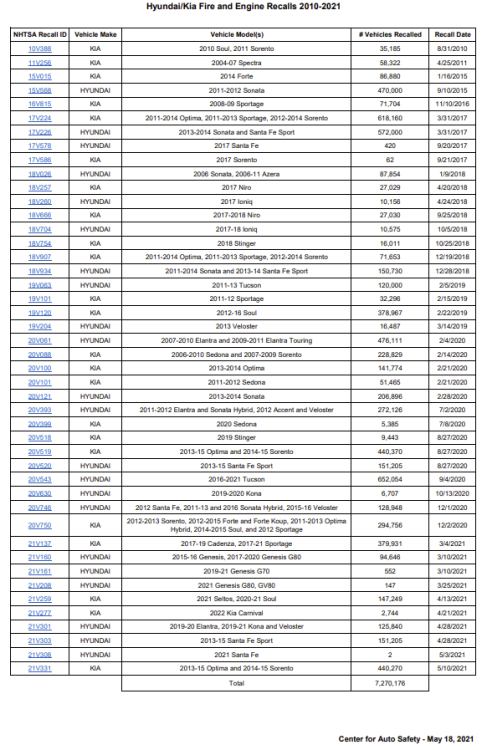 15. Was interested in seeing the details, 7.2 million engine fire recalls from 2010 to 2021. 2010-2021-Hyundai-Kia-Engine-and-Fire-Recalls-5-18-21.pdf (autosafety.org)