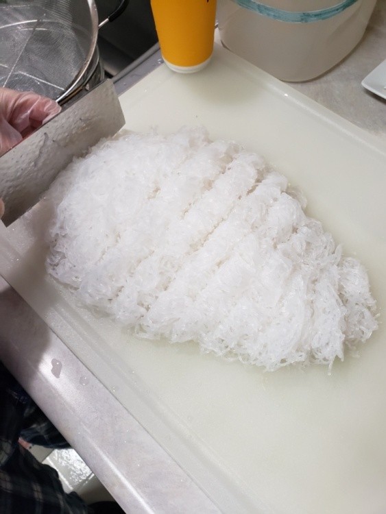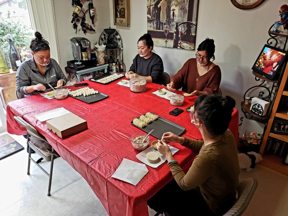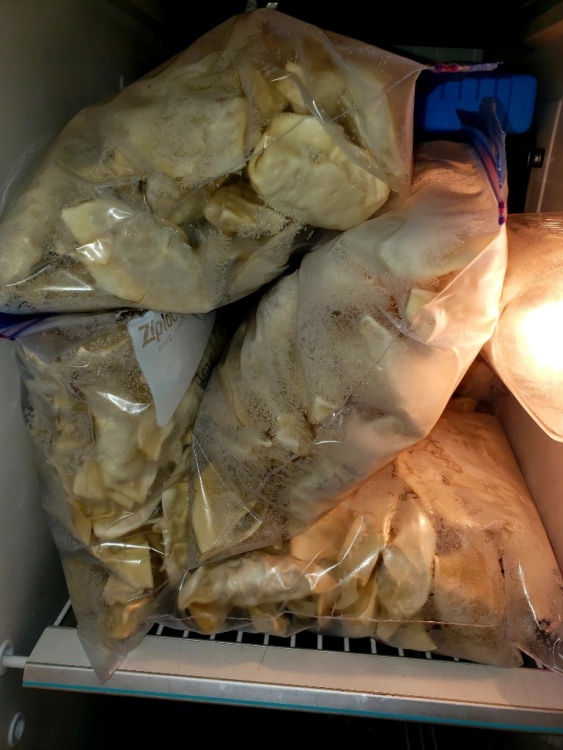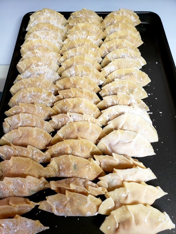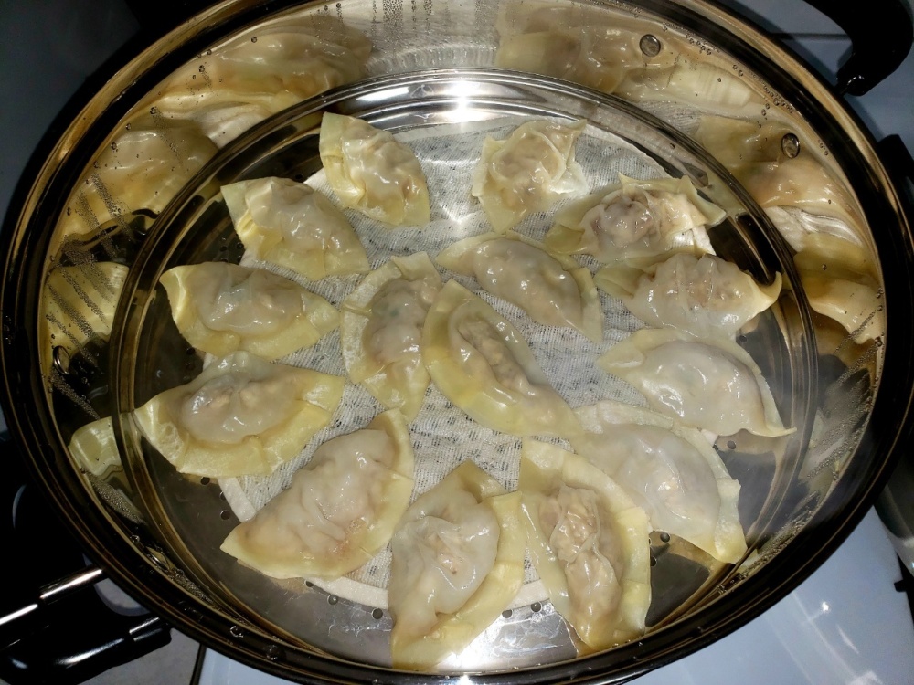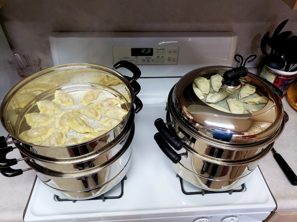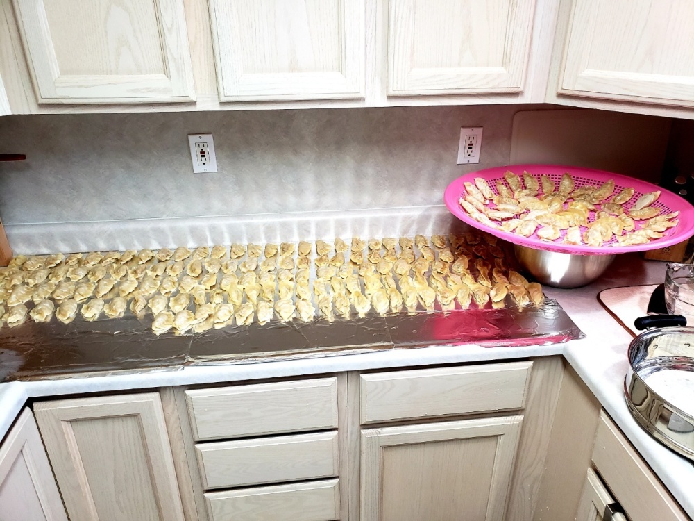 Even with a sewer line problem and also had to have the hot water tank replaced, we still had our annual Pot Sticker making party at the Felt House hold. We made a bit over 600 pot stickers and other than the meat, Tofu and vermicelli noodles, everything else in them was from the garden. Plenty of prep work as the wife and I spent Friday night and Saturday prepping everything and then Saturday night making the filling for the pot stickers. Most people are not aware that water is death to a pot sticker and as such, you have to squeeze as much water out of the ingredients as possible. So Tofu was in a vice for 24hrs being squeezed dry, water chestnuts were squeezed, Monge bean sprouts were squeezed. Next came the cutting up of Spanish Sugar Sweet Onions, green onions, fresh garlic, cooking of the vermicelli noodles and then cutting them up, seasoning everything to proper taste before mixing in a 50/50 mixture of ground sausage and beef and adding some eggs. You start by breaking up the tofu and then in goes the cut up noodles and the rest of the veggie ingredients and then season to taste. Then you have a finished veggie mixture that allows for veggie only Pot stickers if you like. This is a carnivore household so in goes the meat into containers to keep it chilled only taking out a small amount as the pot sticker making process goes. Then you have the assembly of the pot stickers and finished uncooked pot stickers. From here you steam them for 15 min, cool and start to freeze them on cookie cooling racks in the freezer so they stay individual in the bag for use across the holiday season. End result is gallon freezer bags of yummy pot stickers to be pan fried, put into Ramen and many other wonderful soups / dishes. Bon apatite Yes we do take breaks while they are being steamed to enjoy some fresh hot out of the pot, pot stickers with home made sauce on them.