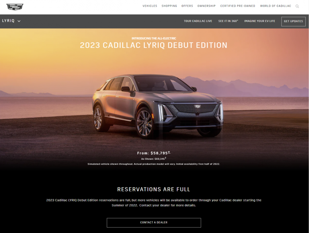 Cadillac had their press release out Saturday Morning. Cadillac Statement on 2023 Cadillac LYRIQ Debut Edition Reservations “Today, reservations for the 2023 Cadillac LYRIQ Debut Edition sold out in just over ten minutes and we continue to see a lot of enthusiasm around the brand – both current product and in our all-electric future. The initial response for LYRIQ has been extraordinary. Since the show car unveiling last year, more than 200,000 people have expressed interest in learning more about the vehicle and our electric future. The opening of reservations for the 2023 Cadillac LYRIQ Debut Edition represents just the beginning of Cadillac’s journey to become an industry-leading, all-electric luxury brand. While 2023 Cadillac LYRIQ Debut Edition reservations are full, more vehicles will be available to order through the Cadillac dealer network starting summer 2022. I can’t wait to share even more about our future EV lineup next year.” – Rory Harvey, vice president, Global Cadillac Within the 1st hour the 2023 model year Launch Edition was sold out. The Lyriq goes into production at the start of 2022. No defined number has been released yet by Cadillac other than to say the first year of production is sold out and states it on their web site. Interesting enough is that if you go into the Lyriq page on their web site for more details, while they also state there in big bold letters that the RESERVATIONS ARE FULL for the 2023 Cadillac Lyriq Debut Edition, they also state that Starting Summer 2022 you can order a Lyriq at the dealership. One must wonder if this would be a 2024 edition model? Full details can be reviewed here: Introducing Cadillac LYRIQ: An All-Electric Future