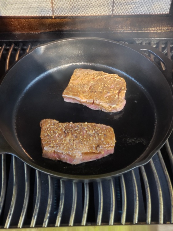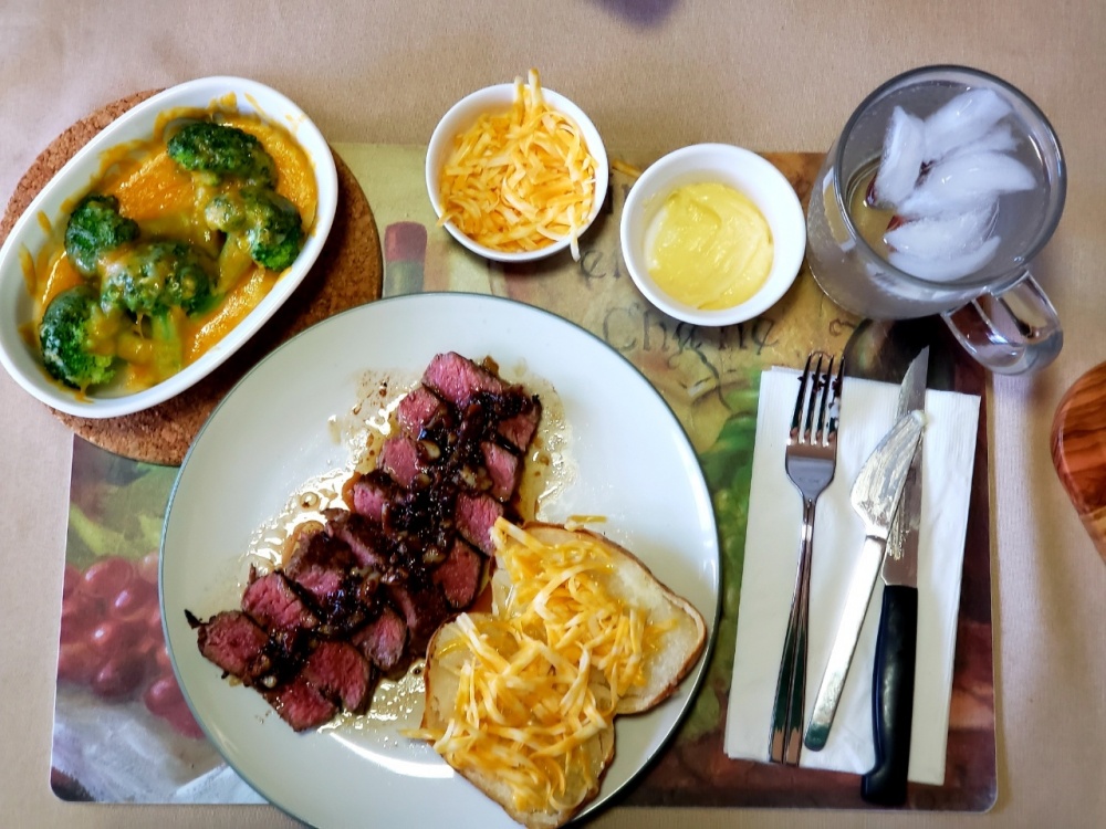 Tonight was a steak night using some of my home grown garlic with clarified butter in caste iron skillet grilled steak. Cheesy broccoli and baked potato.