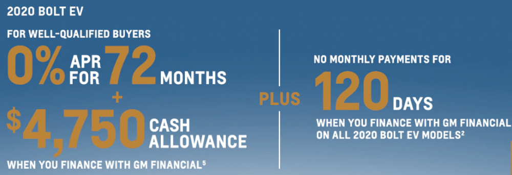GM is offering a Covid-19 purchase package on the Chevrolet BOLT. This puts the Premiere loaded BOLT at $36,000 and the LT at $29,000 with the no payments for 4 months. Seems everything else is getting 0% for 84 months and no payment for 4 months. I did find the following additional cash discounts: Blazer has an additional $3,250 cash allowance Traverse $2,500 cash allowance Tahoe $3,750 cash allowance Suburban $3,750 cash allowance Trucks have the financing, but have to pick a local dealer based on zip code to get additional deal info. Spark has $1,000 cash allowance Sonic $1,000 cash allowance Impala has $2,000 on 2019 models, $1,500 on 2020 models cash allowance Camaro $1,500 cash allowance Corvette Stingray 2019 models $3,250 customer cash All other corvettes are regional deals based on zipcode 2020 Chevrolet Express Passenger $3,500 Customer Cash 2020 Express Cargo van $3,500 customer cash