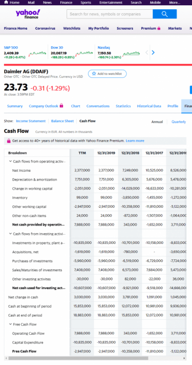 Love how you ignore posting any links to back yourself up. Let me help you with correcting your CONFUSED info. Daimler ended 2019 according to Yahoo finance with a NEGATIVE -$2,947,000 or negative 2.9 billion cash flow. https://finance.yahoo.com/quote/DDAIF/cash-flow/ By Balance Sheet, Daimler has $26.775 billion cash on hand. Yet they are burning through it and before this year is out, much of this will disappear. https://finance.yahoo.com/quote/DDAIF/balance-sheet?p=DDAIF Since you like Yahoo, lets look at the numbers of GM: Cash Flow - https://finance.yahoo.com/quote/GM/cash-flow?p=GM GM is Negative $8.9 Billion Balance Sheet - https://finance.yahoo.com/quote/GM/balance-sheet?p=GM GM is $23.2 billion in cash. So Yes, Daimler has $3 billion more cash than GM. Daimler has $74 billion more than GM in total Assets. That is a small amount in regards to GM NOT having to pay Diesel Gate where Daimler will and that is still Billions to come. Now with Coronavirus shutting the world down, get ready for Depression and the cost of it. I would not bet on Daimler doing any better than GM even with EVs in testing, Daimler has NOT delivered selling them yet where GM has been selling the Bolt for a few years. One Cannot call success when nothing has been delivered YET! 2020 is INTERESTING TIMES! There is a difference between Cash Flow and Cash on Hand and you need to be clear on that when discussing financials.- 282 replies