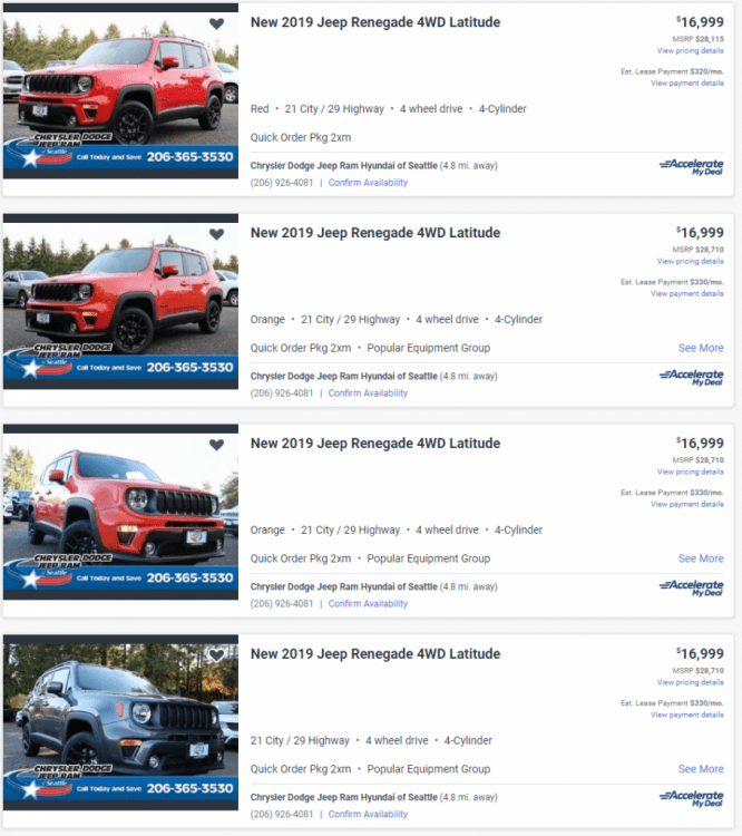 @daves87rs I think you need to go to another market if you do not find any Jeeps in the mid teens. Here in the Greater Seattle area, I did a search on AutoTrader and found 197 AWD/4WD Jeep Renegade Sport and Latitude models all from $16 to $19k. Here is just the first few in the long list.