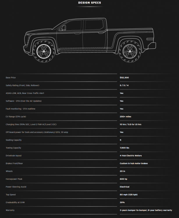 Lordstown Motors now being called Voltage Valley has added more info including they are taking reservations for their AWD in wheel hub motor pickup truck with base truck starting at $52,500. $100.00 deposit to pre-order. https://lordstownmotors.com/ This story is interesting, production start Q3 of 2020 at Lordstown facility. https://www.forbes.com/sites/mergermarket/2019/11/25/upstart-lordstown-motors-racing-to-be-first-with-all-electric-pickup-truck/#4e93f9326bd0 They expect to beat everyone to market with the first EV Pickup Truck for sale.
