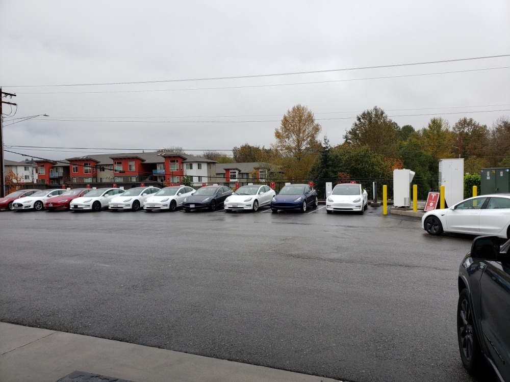 3 deep waiting, seems to be backlogged at this Fred Meyers Tesla Charging station. This is pretty common here be it Tesla or the generic charging stations. You have a major shop point, variety of food places and other retail. Makes it easy to charge, shop, eat and go. FYI: Behind these Tesla's are a huge 5000 Apartment complex and many are Tesla Owners, so I am sure this is a major recharge point for them.