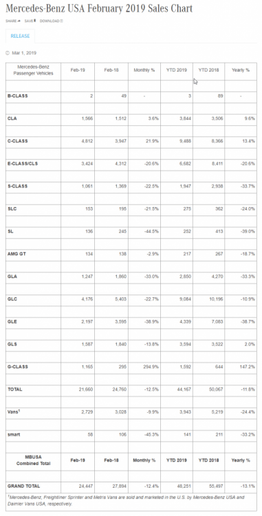 Link to January 2019 sales numbers since we do not seem to have them posted here. https://media.mbusa.com/releases/mercedes-benz-usa-january-2019-sales-chart?firstResultIndex=0&sortOrder=PublishedDescending- 4 replies