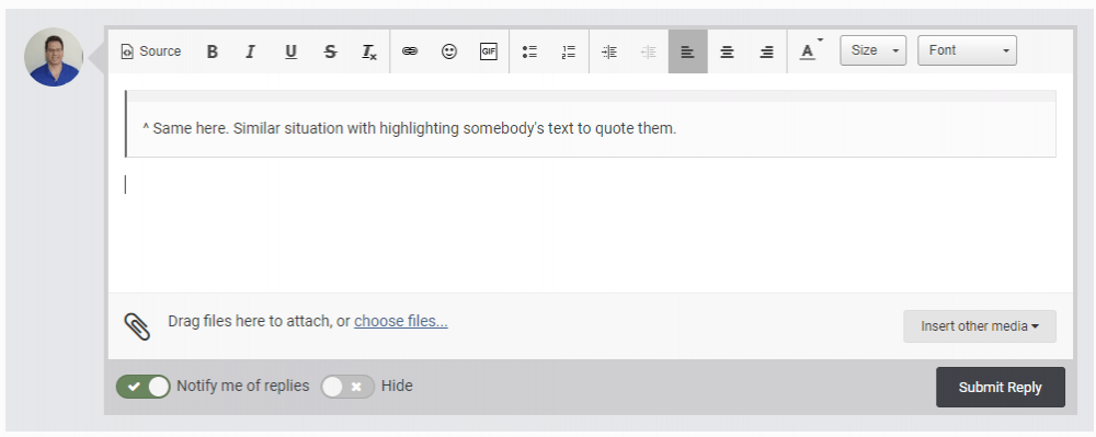 @Drew Dowdell I am using Opera, and have not had any issues till today. Any thread I am in and if someone else posts to it, I usually get the pop-up at the bottom of who posted and do you want to show the most current one. Now it just shows up with a circle to represent the person and a black box. Anyone else seeing this? Yes very weird that part of the info of who your quoting is blank too now.
