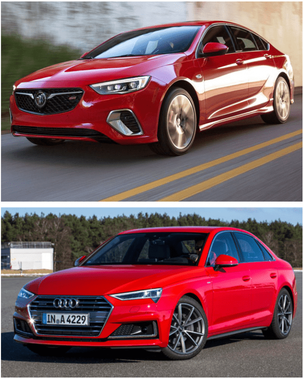 2019 Regal GS to A4 I have to say it is very subjective as I think both cars are very nice looking, but I like the lower portion of the doors on the GS over the A4. 2019 GS versus A4 interior is a bit different. It is a shame that Buick cannot offer anything else but just black. Two Tone is very much needed on cars today to give a nicer more inviting interior to enjoy. I will say I HATE that LCD screen sticking up, to me this is an Afterthought on the A4, cheap bean counting last minute consideration. Kinda like the cheap approach Lincoln Aviator gives me. By now these things should be properly integrated into the Dash.