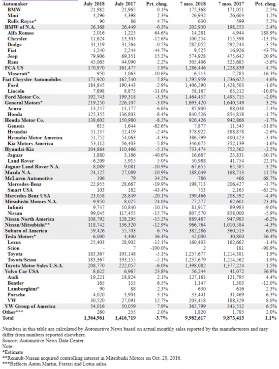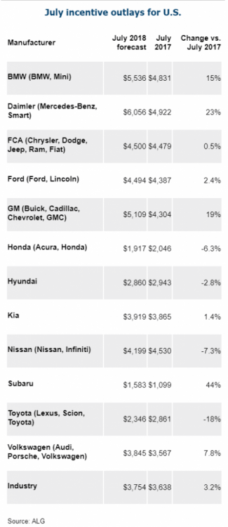 http://www.autonews.com/article/20180801/RETAIL01/180809976/july-us-auto-sales?AID=%2F20180801%2FRETAIL01%2F180809976 Good read on the industry, we have seen these numbers in what Will posted, but always good to review them again. It would seem that the Germans especially Daimler is leading the charge in Sales Incentives. One has to wonder what is going on in those companies.