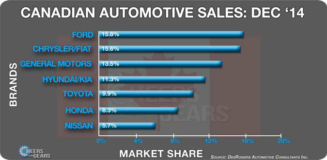 Canadians drove car sales to their highest-ever levels, with 1.849 million vehicles sold in 2014. Dealers were especially merry at the end of the year, with certain automakers experiencing record December sales. Of note, 2014’s pickup truck sales accelerated nearly 20% over 2013’s numbers (83,391 vs 69,788). Despite repeated warnings about record personal debt levels, Canadians continued to feel good about their economic prospects. Earlier in 2014, Canada’s middle class usurped America’s as the wealthiest in the world. Automotive analysts are expecting the momentum to continue. However, reduced oil prices could temper 2015, impacting resource-based provinces including Alberta and Saskatchewan. Real-estate values in petro-centres such as Calgary will become precarious as both head offices and workforces can expect downsizing. With analysts predicting oil prices at $40 (USD) per barrel, the Canadian Dollar is being slated for the 75-cent (USD) range. Canada’s manufacturing sector will celebrate the lowered loonie, granting increased competitiveness against US manufacturing. Ontario is already banking on renewed interest by automotive manufacturers to continue production in the province. The Numbers Ford - 15.8% 22,625 - December 291,823 - 2014 Ford ends the year as Canada’s top automaker, a title held for five consecutive years. Chrysler/FIAT - 15.6% 21,613 - December 290,004 - 2014 Ram is Canada’s second best-selling vehicle. Chrysler’s truck brand picked up record December and annual sales, of 8,324 and 86,590 units respectively. General Motors - 13.5% 19,247 - December 249,800 - 2014 GM’s pickup sales hit a record year, with 90,005 trucks sold — a three percent gain over 2013. Hyundai/KIA - 11.3% 10,897 - December 208,111 - 2014 Toyota - 9.9% 10,906 - December 183,286 - 2014 Honda - 8.3% 11,934 - December 152,893 - 2014 The Honda Civic continues its 16-year run as Canada's top-selling vehicle. Nissan - 5.7% 7,330 - December 105,154 - 2014