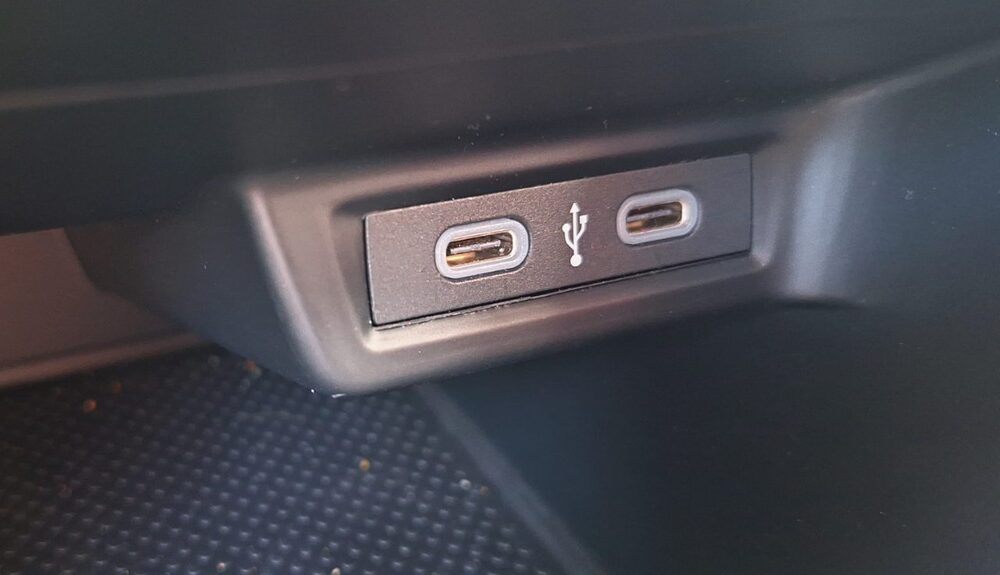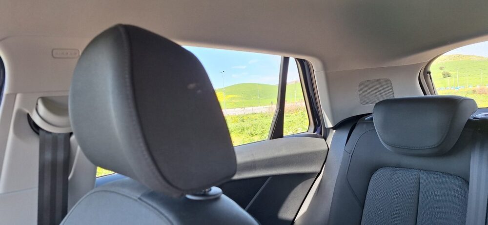 INTERIOR PHOTOS This is the overall view of the front of the cabin and dashboard upon opening the driver's door and it has a pleasing and balanced feel. This is the central instrument cluster for the driver, with a digital speedometer inside the tachometer. On the 4 corners are the time, exterior temperature, range, and odometer, with the gear slightly above that. Coolant temperature and fuel levels are shown in linear form. This is the touch screen, which is fairly easy to use, and is housed under the cowl, hence no "laptop left open" look, which I tend to dislike. This is the entirety of the center stack, with air vents below the touch screen, a sensible climate control panel, a storage and USB cubby, and some driving control buttons on the console to the left of the gear selector, which is nicely finished and feels good to the touch when moving through the gear selections. The USB ports are of the C-cable variety, with the opportunity to use the older style by plugging it into a cigarette lighter in or near the console box. Steering wheel controls are somewhat easy to use, with volume and track selector on the silver buttons symmetrically placed on each side. Clearly, the preferred position is "A" for automatic, and it's an easy thing to overlook if not your daily driver. The rear seating area seems to be sufficient for this type of vehicle. Visibility over the shoulder and toward the rear is fairly good. This is the available storage space with the rear seat up and, as you can see, there is the cover that comes down over the exposed space, which is something that is almost necessary.
