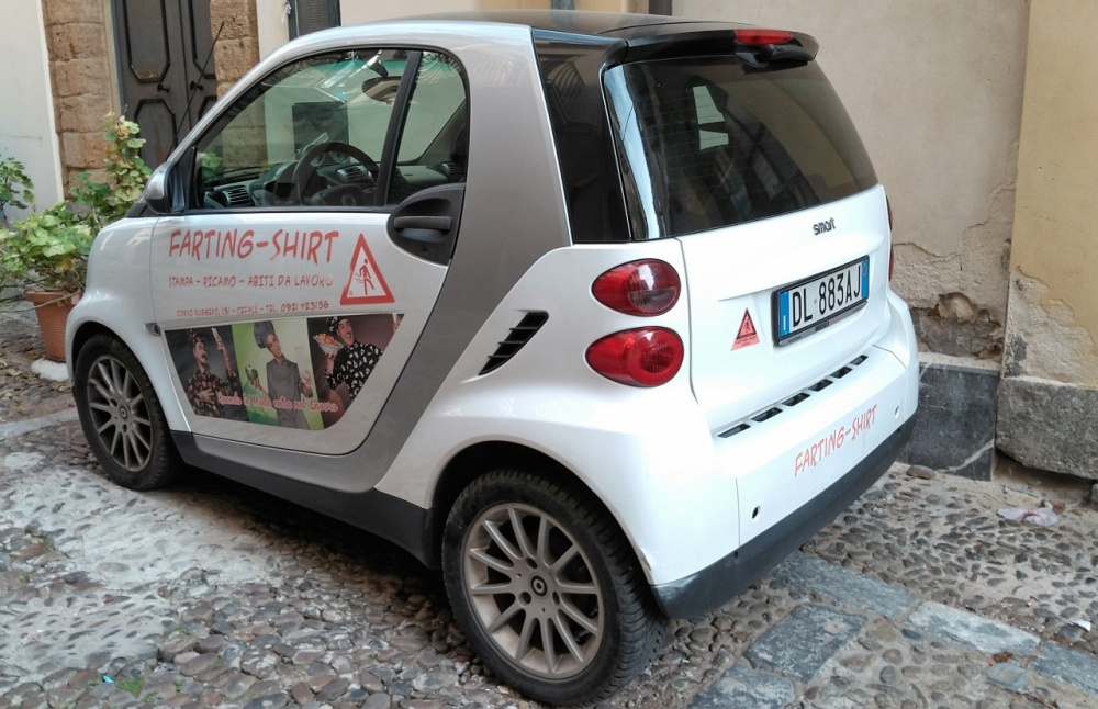 In doing some photo organizing, I found this. (Someone once told me that, in Japan, "young" people wear t-shirts with some random English word on them, just to have something in English on their t-shirt. Whatever floats your boat.) You can see some random things in Europe, too, and here's a fairly goofy choice of words I saw on a Smart for Two in Sicily. This would be funny to most Anglophones.