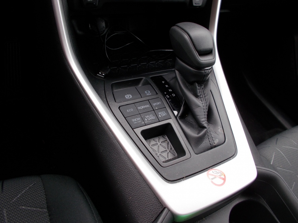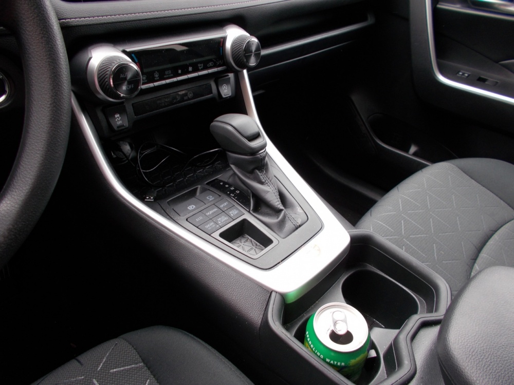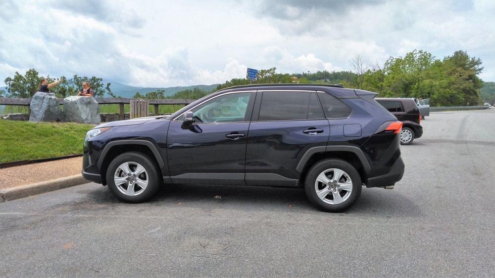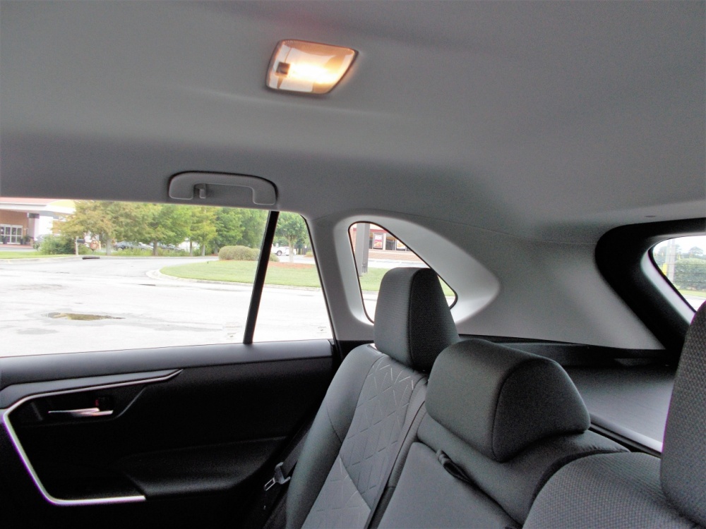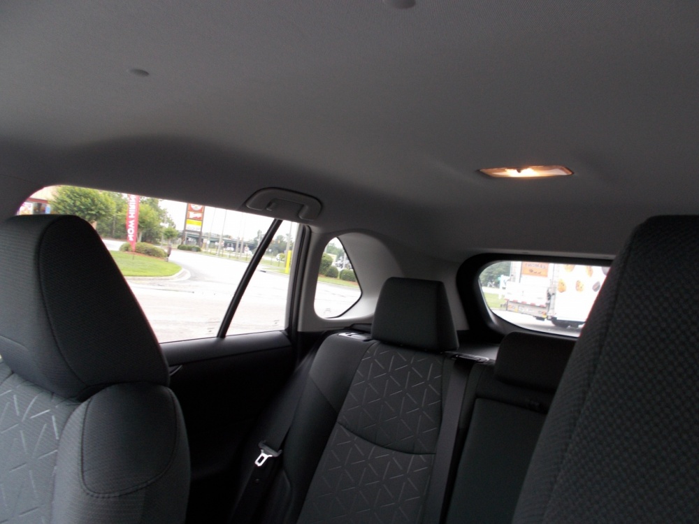 Photos: 1. The Toyota Rav4 at a roadside pull out 2. The overall interior environment upon entering; I'm not digging on the urethane steering wheel, nor its controls 3. The fairly firm and supportive front bucket seats, durable looking cloth fabric, headrests for which I haven't decided on their ergonomics, and a large storage area inside the center console 4. The overhead cabin light is more easily adjusted from the rear seat; the tonneau cover hides what you have in the storage area well 5. This is what the rearward view looks like from the driver's seat looks like; the seating area for those in the rear seats is very generous 6. The two main bezels make sense but other automakers have displayed the info in the middle in more logical groupings and colors, even the last-gen Ford Focus 7. Those two knobs were hilarious and the grooves in them look sort of dumb. Hey, I've found the radio! NOT. Those are temperature adjustments, and then some. I meant to mention that, while the air blows out of the center vents very well, the flow is weaker from the side vents ... even weaker than in the older domestic cars I've had. The "laptop left open" infotainment that is ubiquitous these days is up above the center stack. (Some of you probably wouldn't like the music I was streaming.) 8. These are the window and lock controls in the door armrest. There is another cup holder below, with a map pocket. 9. The height of the console is good relative to the seating position and the seating position is also good. You have cars, such as the now departed last-gen LaCrosse and which are favored by more mature people, where the console height has the drivers sitting in there like astronauts ... not so here. 10. The drive mode buttons are conveniently placed, as is the parking brake control, right above them. 11. One of the better vantage points for the Toyota Rav 4 - - - - - End of photos