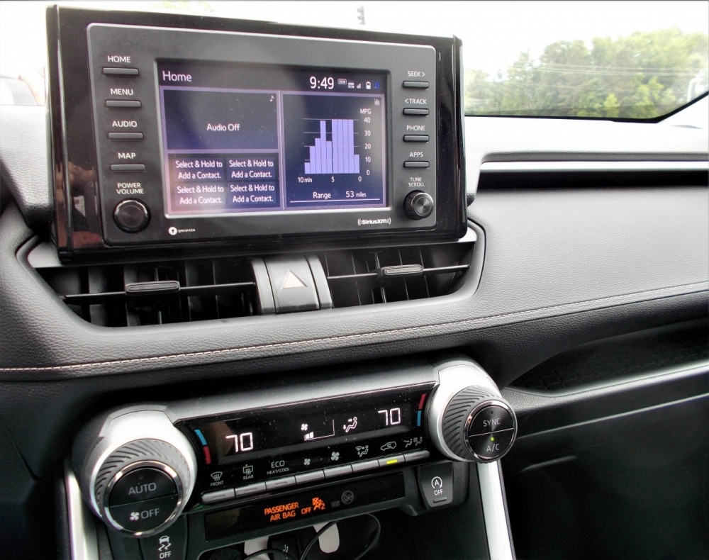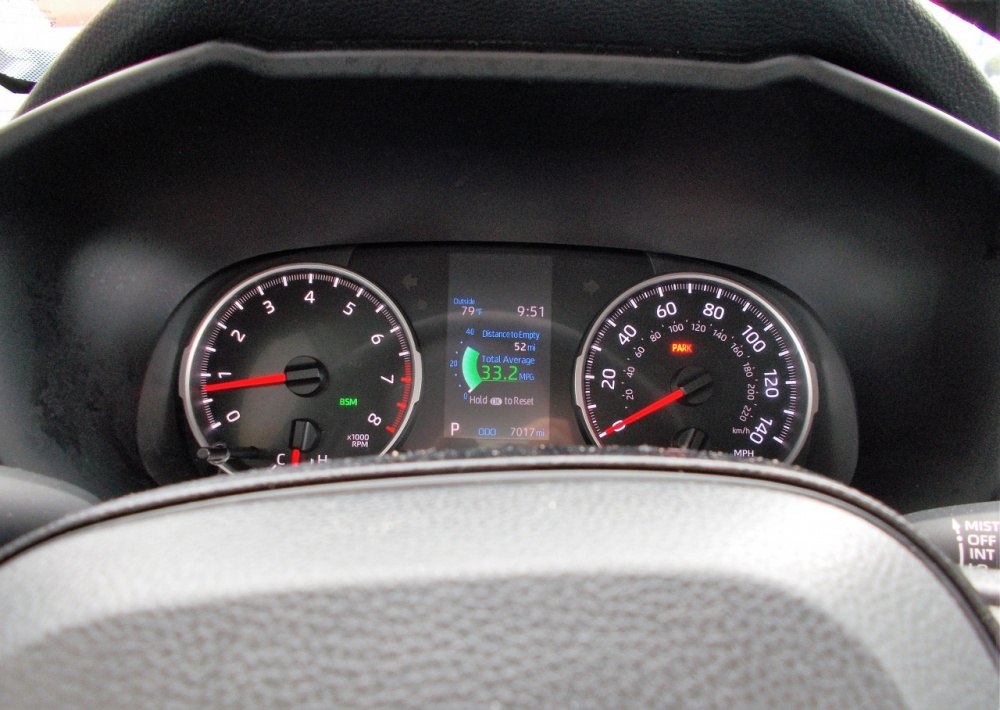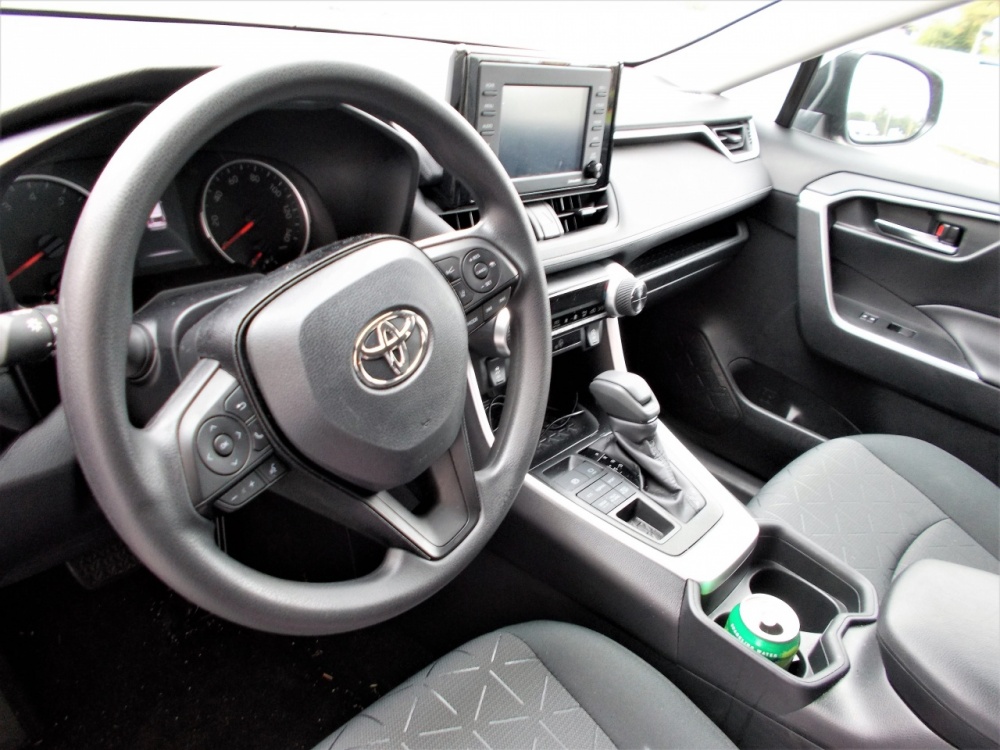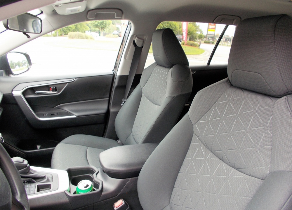 Photos: 1. The Toyota Rav4 at a roadside pull out 2. The overall interior environment upon entering; I'm not digging on the urethane steering wheel, nor its controls 3. The fairly firm and supportive front bucket seats, durable looking cloth fabric, headrests for which I haven't decided on their ergonomics, and a large storage area inside the center console 4. The overhead cabin light is more easily adjusted from the rear seat; the tonneau cover hides what you have in the storage area well 5. This is what the rearward view looks like from the driver's seat looks like; the seating area for those in the rear seats is very generous 6. The two main bezels make sense but other automakers have displayed the info in the middle in more logical groupings and colors, even the last-gen Ford Focus 7. Those two knobs were hilarious and the grooves in them look sort of dumb. Hey, I've found the radio! NOT. Those are temperature adjustments, and then some. I meant to mention that, while the air blows out of the center vents very well, the flow is weaker from the side vents ... even weaker than in the older domestic cars I've had. The "laptop left open" infotainment that is ubiquitous these days is up above the center stack. (Some of you probably wouldn't like the music I was streaming.) 8. These are the window and lock controls in the door armrest. There is another cup holder below, with a map pocket. 9. The height of the console is good relative to the seating position and the seating position is also good. You have cars, such as the now departed last-gen LaCrosse and which are favored by more mature people, where the console height has the drivers sitting in there like astronauts ... not so here. 10. The drive mode buttons are conveniently placed, as is the parking brake control, right above them. 11. One of the better vantage points for the Toyota Rav 4 - - - - - End of photos