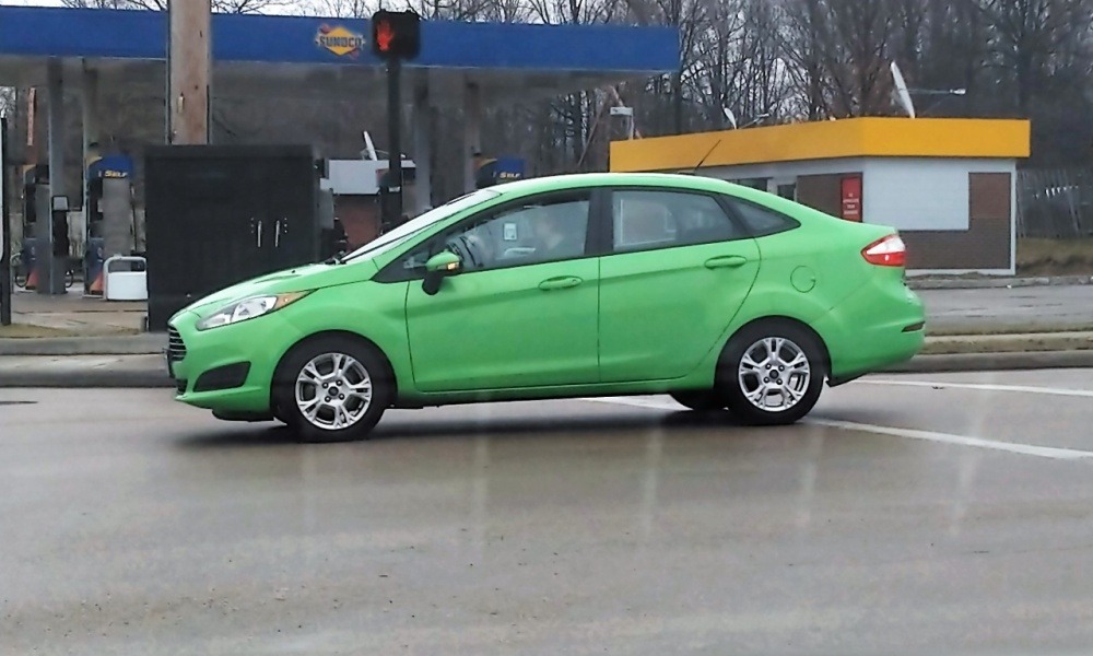 Reaching back into the "photo file" Seen on March 5 - Pontiac GP ('05 to '07, keyless trunk lid) ... spotless ... oddly combination: a sunroof, but with the standard bargain basement wheel covers Seen a few days ago - Ford Fiesta - this thing jumps out at you ... for some reason, the econoboxes have all the weird colors ... interesting that it has the turn signals in the outside mirrors, which means it's not the base model