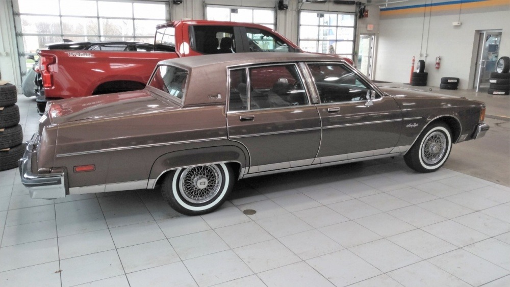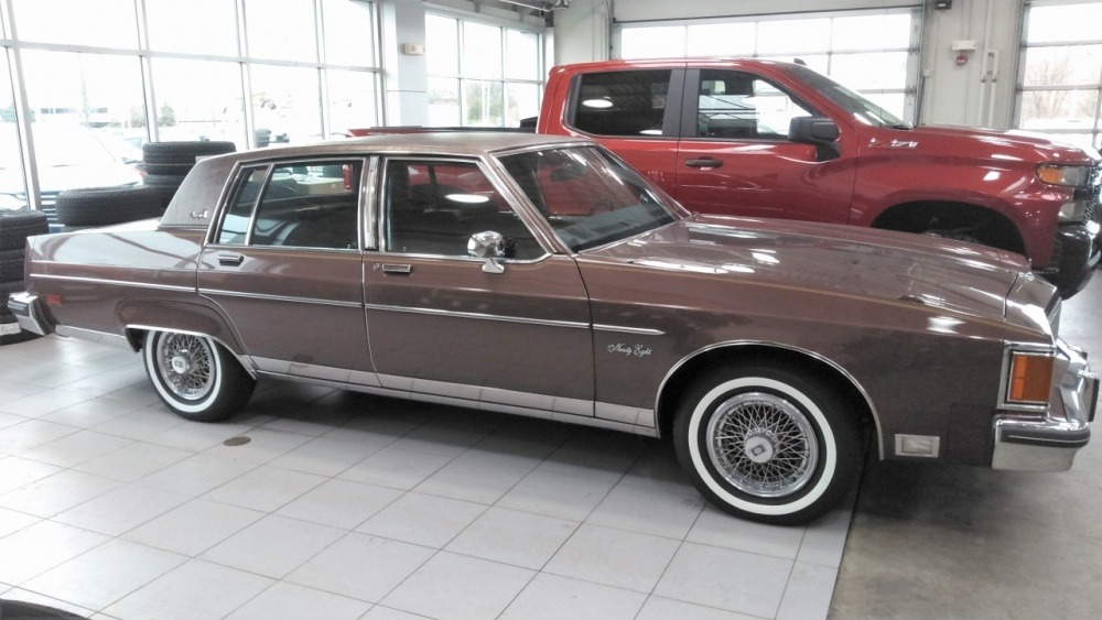 Saw two interesting cars today: In the supermarket parking lot, a guy was getting into an "old" Riv that had temporary plates. I asked him if it was a '91 or a '92. It was a '92. He told me it was sapphire blue metallic (the darker metallic blue) and it had blue leather bucket seats. He said it had a little over 60,000 original miles and he got it for about $3,500. He was beaming about it. It all looked good except that it had the padded blue landau roof that cluttered up the lines of the side rear passenger window and the rear back lite. These cars looked better without vinyl tops. At a dealership to look for a part, I saw this classic. Wow. It was a 1983 and ran with the 5.0 (307 c.i.) V8. I didn't get a photo of it, but the Brougham interior was equally in perfect condition. It was hard to fit this Olds 98 (aka "la cathedrale roulante") into the photo.