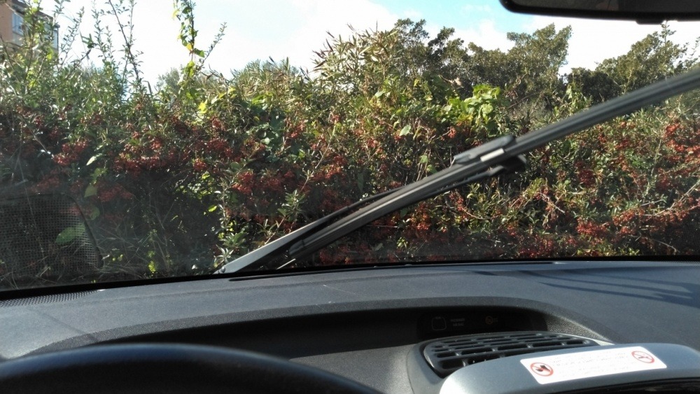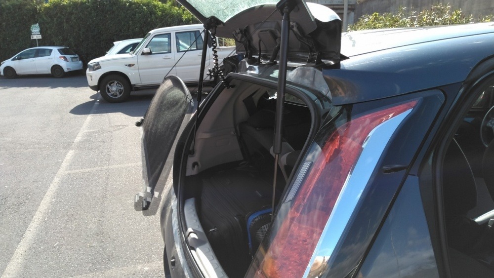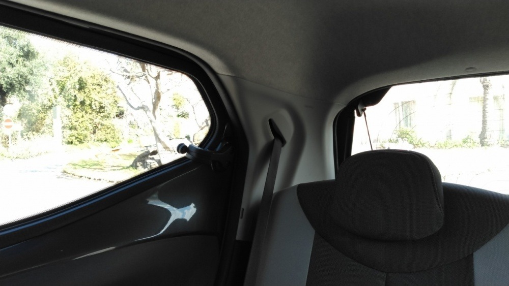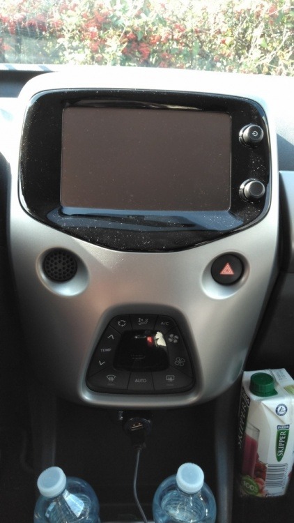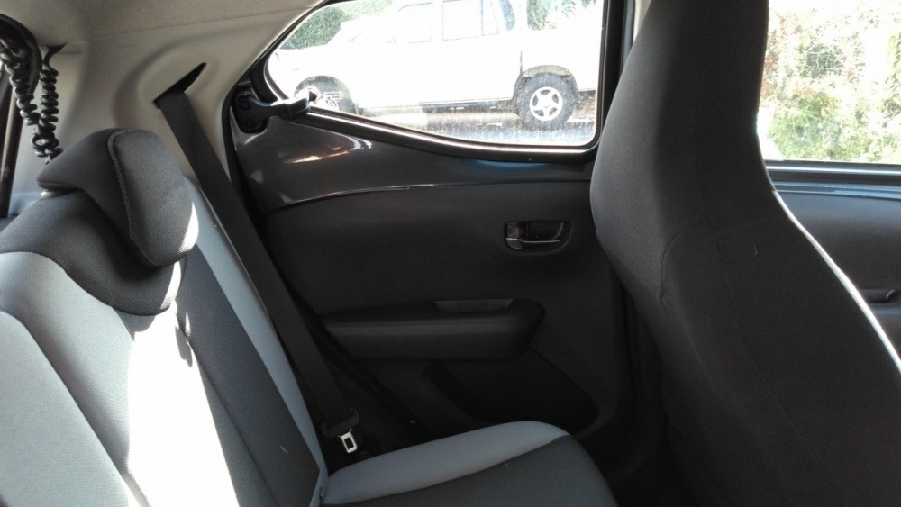 Photos taken during this 5 day rental Here's the Toyota Aygo at a filling station and Autogrill adjacent to the highway. That's it - and the one on the left is a roll-aboard that you can't roll aboard into the cabin when you stuff it to the gills. The cheap rear compartment cover was flailing with the wind (a small vid would have been better) and did not engage into its slots that easily. Here's the IP - speedometer (kms), tach to the left, idiot lights to the right, and a decent steering wheel set-up (stitched, but probably still urethane). Here's the center stack - the infotainment screen was easy to use and the climate control cluster was even easier to use (less is more). One big windshield wiper for this little windshield - note that the trees and bushes kept their leaves during winter. This is the automatic gear selector - no console, armrest, or anything like that ... if you look to the bottom right, you can see the "E." There's not much in the way of rear leg room and you push out the rear windows like you would vents - they don't roll up or down. Here's the split rear seating and you can see the cover over the small rear trunk/storage area. Even with a thicker rear sail panel / C-pillar, visibility is very good, largely because it's a small car. - - - - - End of photos -