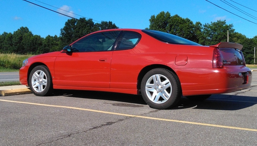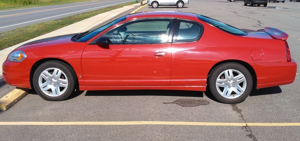 22. I'm going to put up some retro photos, which I have had in disarray. Here's a last-gen ('06 or '07) Monte Carlo I frequently see at a store parking lot. While in fantastic condition, I'm not a fan of red. It's an LT model. I see 1 exhaust pipe, meaning a 3.5 V6. I only bring this up because this engine was EPA rated at something ridiculously high, like 32 mpg, on the open road. However, it wasn't that ridiculous after all. I've rented numerous and they got 32, 33, and even 34 mpg under ideal conditions, which is amazing for a car this heavy and for having 211 HP. I don't know how they pulled that off, and with only 4 speeds in the automatic transmission. You get up to 37 or 38 mpg these days for downsizing all the way to 1.8 liters and 4 cylinders! The only thing wrong with this car, if you can see it, is the two retro blocks of black racing paint on the hood. Nope. Less is more.