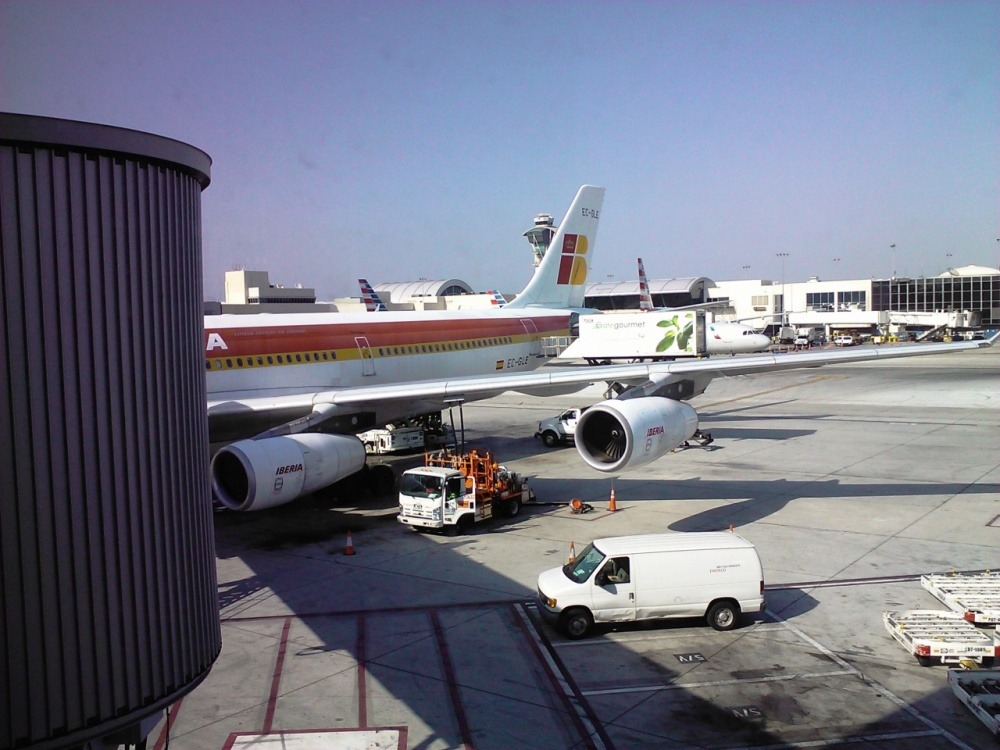 Random thought and random view of a YouTube lasting less than one minute Iberia Airbus 340-600 wearing the most recent livery taking off at LAX and headed to Madrid - about 11 hours. Foggy day at LAX and they usually take off over the ocean, to which LAX is adjacent.