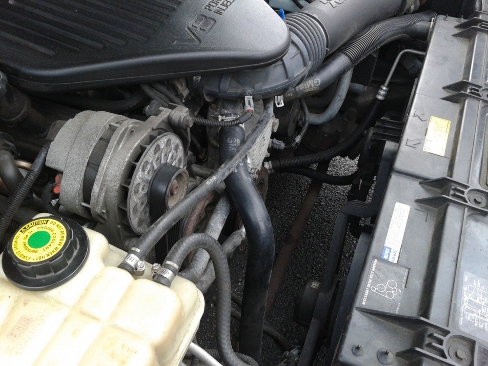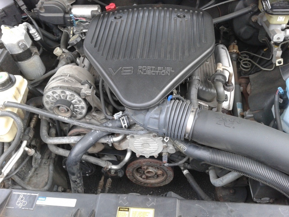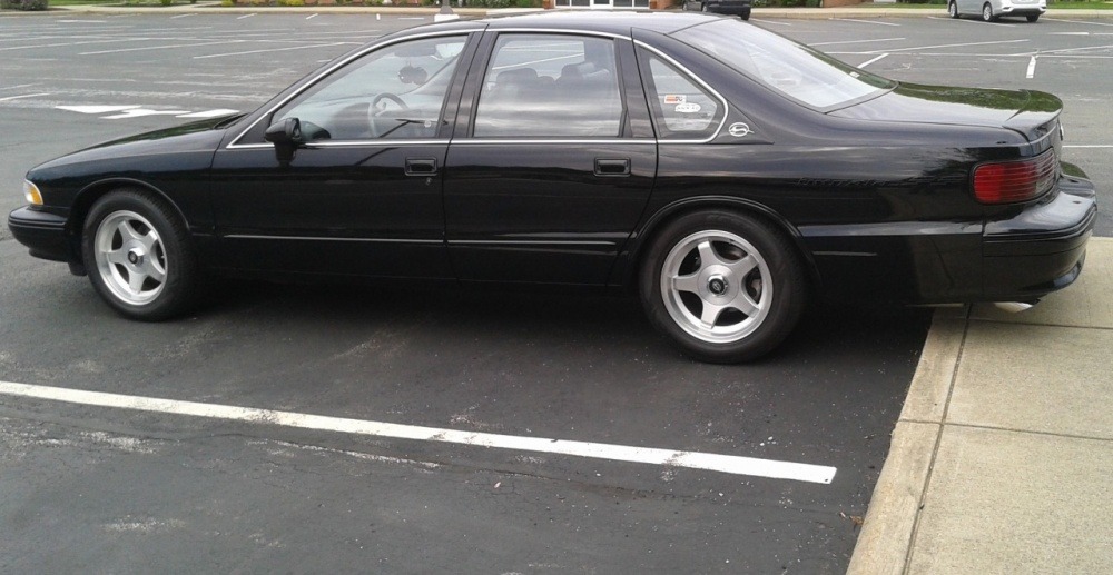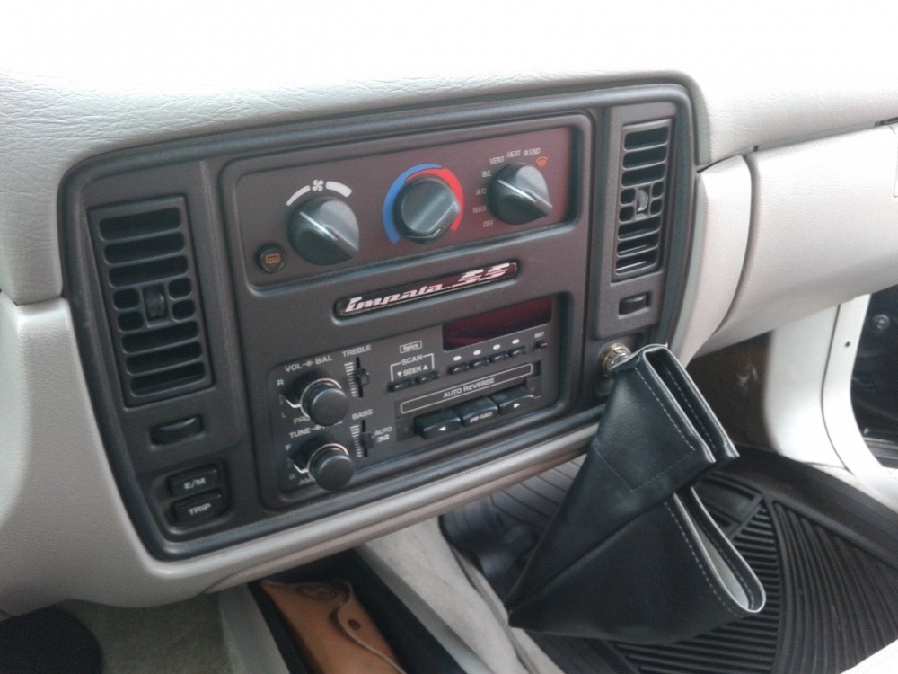 I get a grace period. It's actually June, but I spotted this one in May, on the 18th to be exact. It belongs to someone I know. It is a 1994 Impala SS (same as the 1994-1996 Caprice) and is equipped with a 5.7 V8. It is a hobby car for this individual and not a daily driver. It has the buckets and a non-operating console, so the shifter is located on the column. It was explained to me that the shifter was on the console in 1996 ... where it should be. Familiar shape (Caprice) but different execution (Impala SS): This bas relief applique on the rear fender came standard: Old school - turned the "right" way, with the transmission behind it and lots of room. Identical to the 4.3 "baby" V8 of the same years in appearance. The placard is the only way to distinguish them. Don't be scraping off the placard: Look at the clearance between the radiator/fans and the engine. Also, note the pulley diagram. It's a weird one ... all the stuff is on the left: Nice ... only the speedometer is digital (along with the odometer) but everything else is analog. Presumably less to go wrong: Old school center stack, with a cassette player, and a huge glove box bin. Buckets, in leather, but the shifter is not on the console: