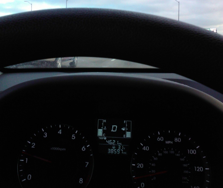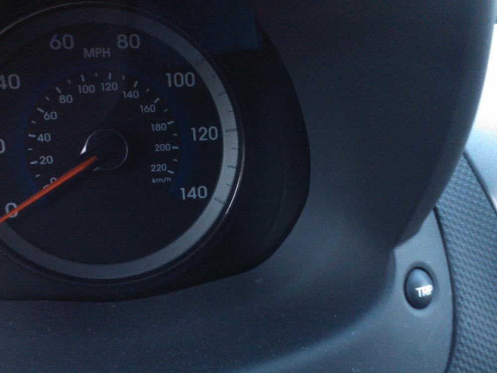 I tend to take photos when I rent ... Basic econobox Hyundai Accent (in hatchback version) White works but the wheel covers don't do much for me - this was the base model Seats were firm and supportive, but a little tough on the rump - the way they were put together seemed durable and the bolstering and ergonomics were decent for the price point (note that the base model lacked an actual console) Here's the thick rear view in this hatchback ... it's far less of an issue in the sedan. For 2018, only the sedan continues. This is one of the most intuitive dashboard setups I've seen for this price point and it's nicely shaped and easy on the eyes. Without steering wheel audio controls, this is all that is on the steering wheel - the cruise control, and it has fewer toggles than most. At this price point and in this model, you can't adjust cruise mode to a speed that you see as a digital number. Everything you really need at one glance ... I thought it was very cool that the trip odometer button was unmistakable and seen at the bottom right. You push on it and it rotates through the tidbits of automotive information. This was a likable little car and I would have preferred to have experienced it as a sedan.