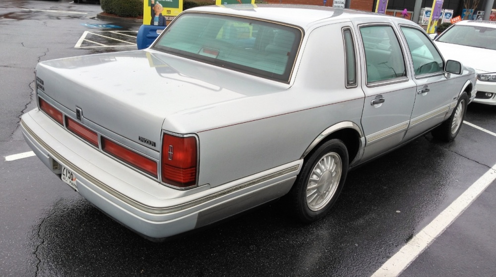 February 11 I see the rounded Town Cars every now and then, but how often does one see these formal, boxy ones with that real thin opera window in the rear sail panel? On Atlanta's north side, in Sandy Springs, GA. Probably a 4.6 V8. Spotless. -